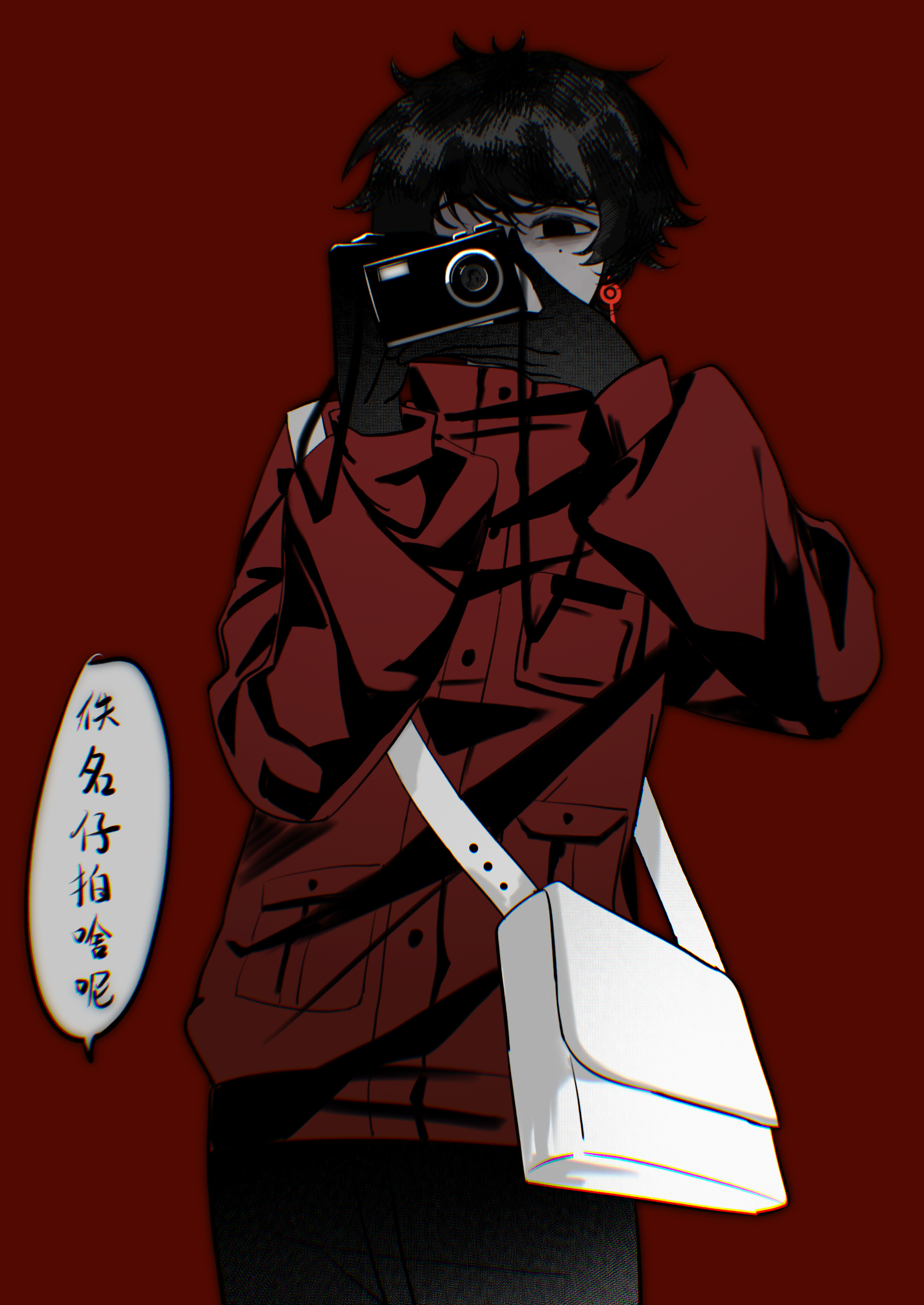 1boy absurdres bag black_eyes black_gloves black_hair black_pants camera camera_around_neck chinese_commentary chinese_text commentary_request cowboy_shot earrings gloves highres holding holding_camera jacket jewelry li_yuting_(male) long_sleeves male_focus messenger_bag pants red_background red_jacket ruiy6 short_hair shoulder_bag simple_background solo speech_bubble touqi_guaitan white_bag