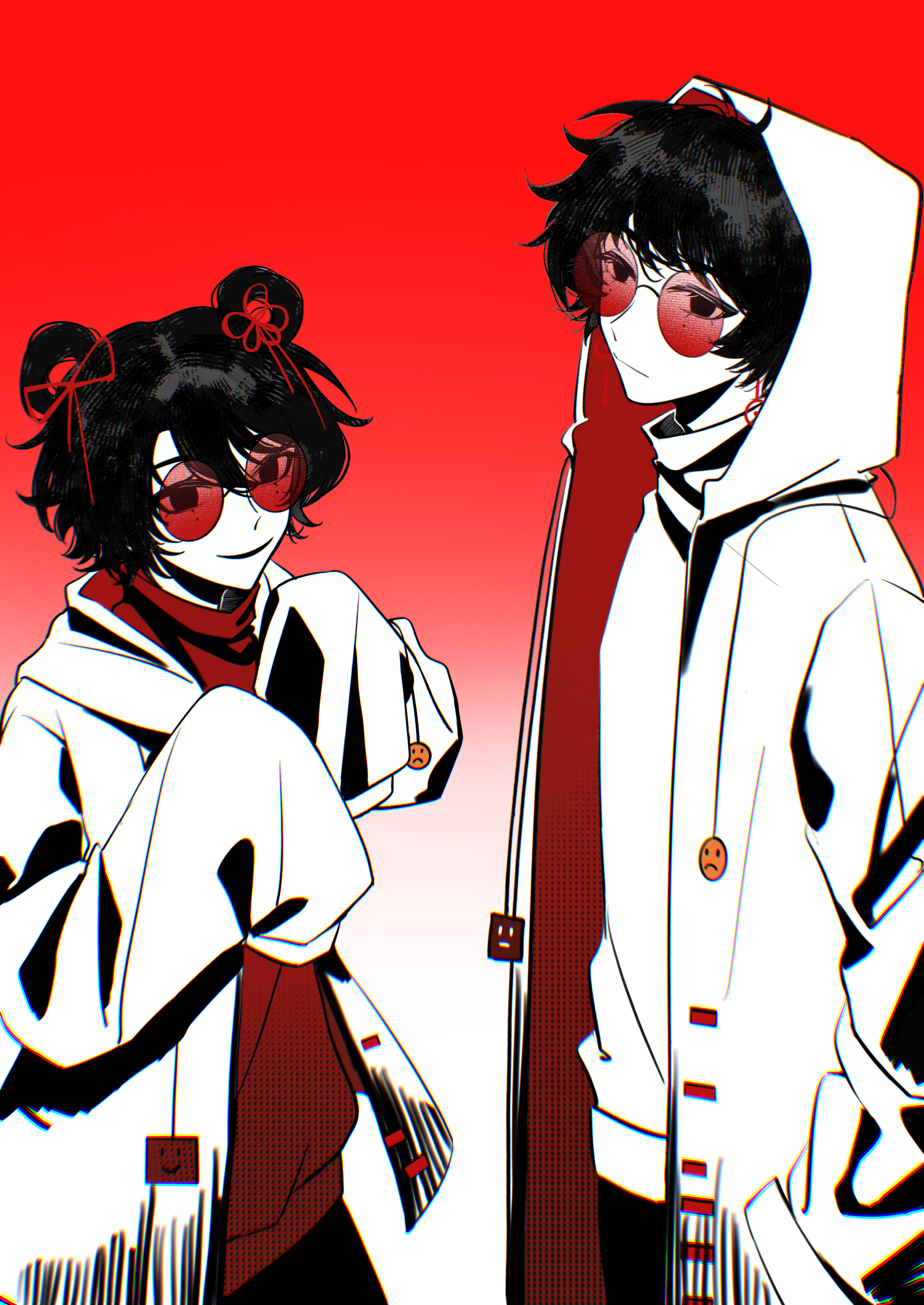 1boy 1girl absurdres chinese_commentary closed_mouth coat commentary_request dual_persona flower_knot gradient_background greyscale_with_colored_background hair_ribbon highres hood hood_down hood_up hooded_coat li_yuting_(female) li_yuting_(male) long_sleeves mole mole_under_each_eye mole_under_eye multiple_moles open_clothes open_coat open_mouth red-tinted_eyewear red_background red_ribbon red_shirt ribbon round_eyewear ruiy6 shirt short_hair sleeves_past_fingers sleeves_past_wrists smile spot_color tinted_eyewear touqi_guaitan two-sided_coat two-sided_fabric upper_body