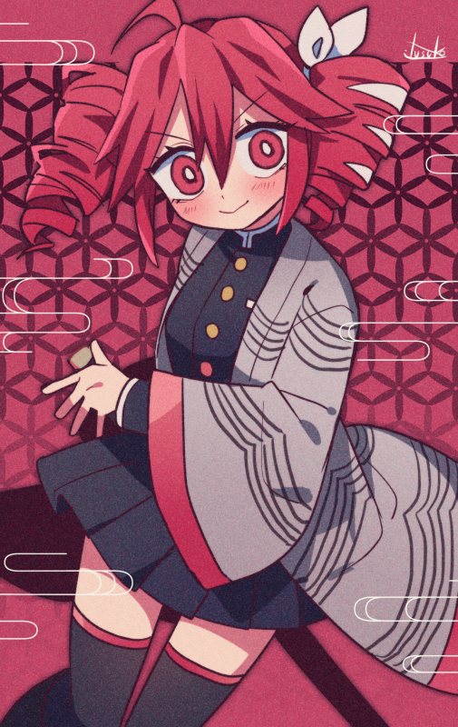 1girl ahoge black_shirt black_skirt black_thighhighs blush bow buttons double-parted_bangs dress_shirt drill_hair hair_between_eyes hair_bow hair_ribbon kasane_teto kasane_teto_(sv) kasane_teto_(utau) kimetsu_no_yaiba pleated_skirt red_background red_eyes red_hair red_trim ribbon shirt skirt skirt_set smile solo synthesizer_v thighhighs twin_drills utau white_bow white_ribbon yuusuke-kun zettai_ryouiki