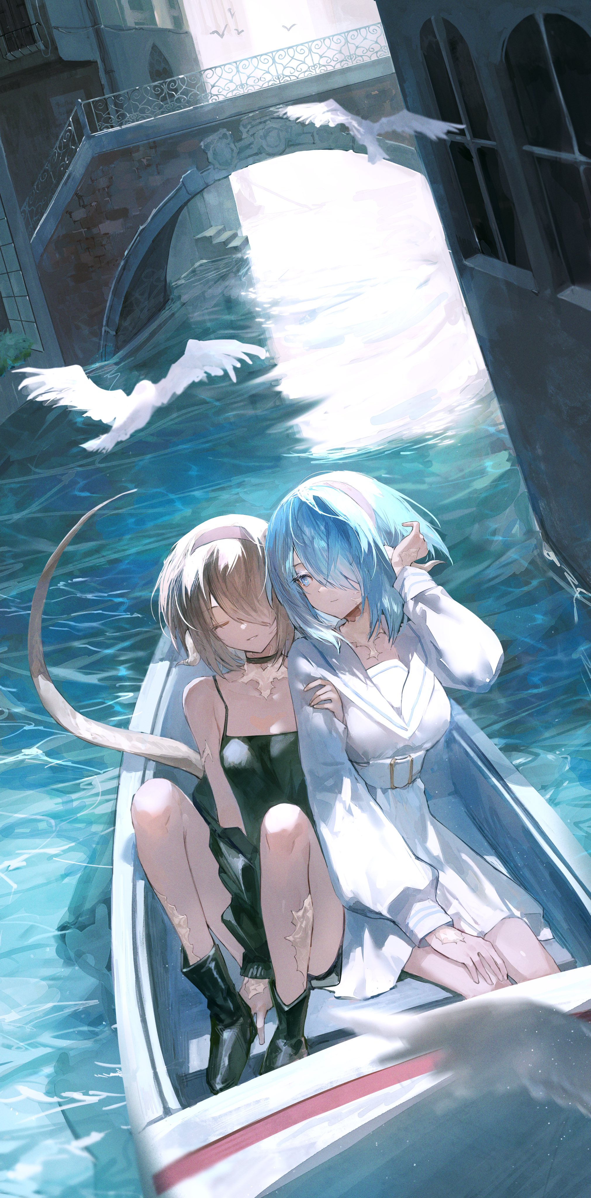 2girls absurdres au_ra blonde_hair blue_eyes blue_hair boat dragon_girl dragon_horns dragon_tail final_fantasy final_fantasy_xiv highres horns looking_at_another low_horns multiple_girls ocean shikina_(mochigushi_) short_hair tail warrior_of_light_(ff14) watercraft white_horns white_scales white_tail yuri