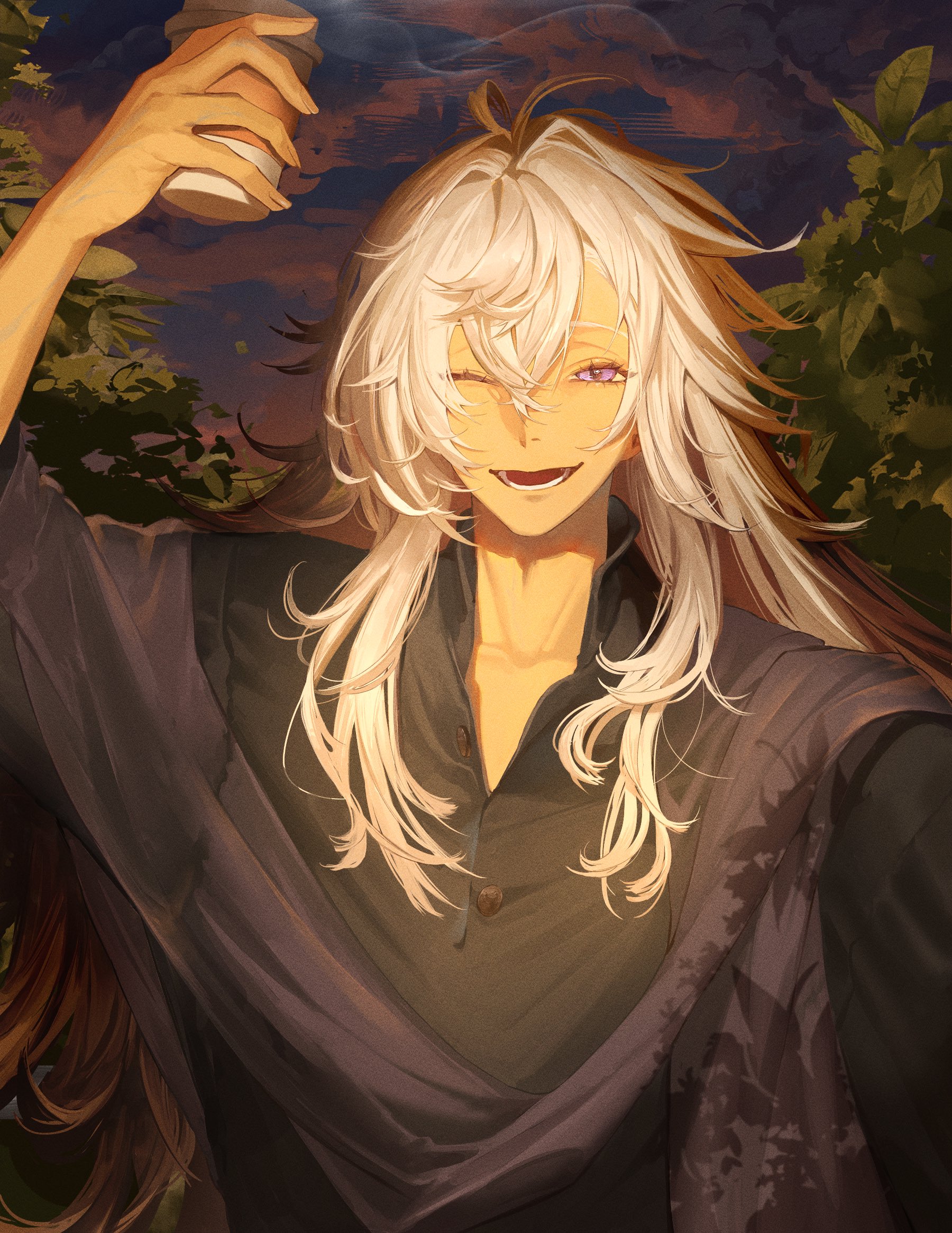1boy ahoge black_shirt cloud cloudy_sky cup fate/grand_order fate_(series) hair_between_eyes hand_up highres holding holding_cup looking_at_viewer male_focus merlin_(camelot_&_co)_(fate) merlin_(fate) official_alternate_costume one_eye_closed open_mouth outdoors print_scarf purple_eyes purple_scarf purple_sky scarf shirt sky smile solo tree upper_body white_hair zuraa_(naunau_seijin)