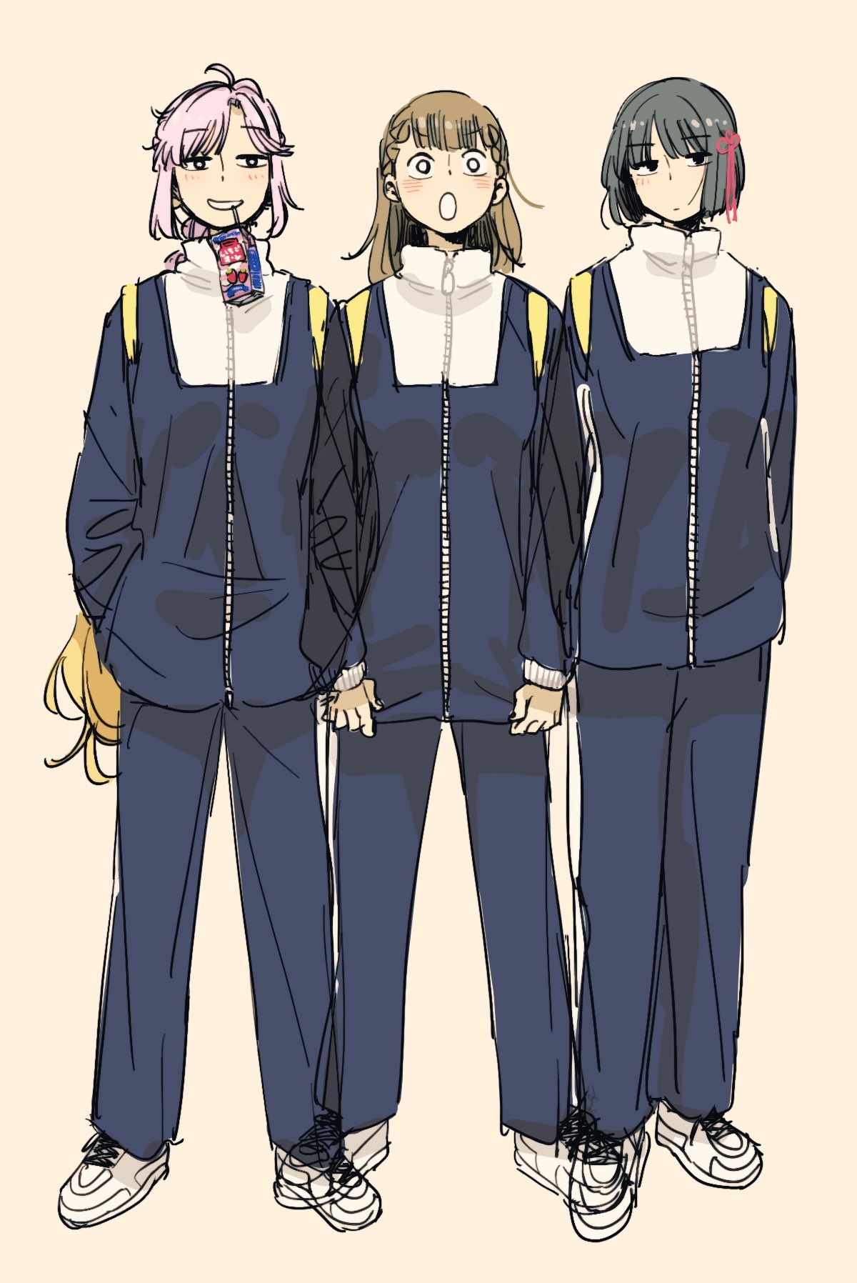 3girls 524ryo :d :o ahoge anyoji_hime arms_at_sides black_hair black_jacket black_pants black_track_suit blonde_hair blunt_bangs blunt_ends blush braid bright_pupils brown_hair center-flap_bangs closed_mouth commentary_request drink_carton drinking_straw flower flower_knot full_body grin hair_flower hair_ornament half-closed_eyes hands_in_pockets highres jacket jitome kachimachi_kosuzu link!_like!_love_live! long_hair long_sleeves looking_at_viewer love_live! milk_carton momose_ginko mouth_hold multi-tied_hair multicolored_hair multiple_girls official_alternate_costume open_mouth pants pink_hair ponytail shoes short_hair side_ahoge side_braids sidelocks smile sneakers standing straight_hair swept_bangs teeth_hold track_jacket track_suit two-tone_hair very_long_hair virtual_youtuber white_footwear white_pupils