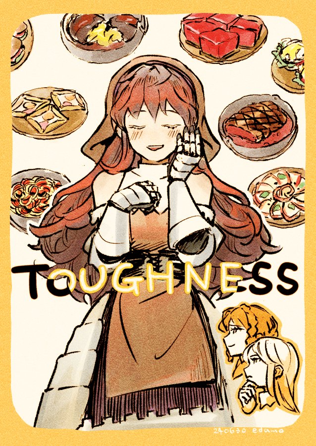 1boy 2girls aramis_(unicorn_overlord) armor artist_name blush border braid covered_collarbone cropped_head dated edamo english_text faulds food gauntlets hand_on_own_cheek hand_on_own_chin hand_on_own_face hat hilda_(unicorn_overlord) long_hair multiple_girls primm_(unicorn_overlord) red_hair red_hat smile unicorn_overlord yellow_border