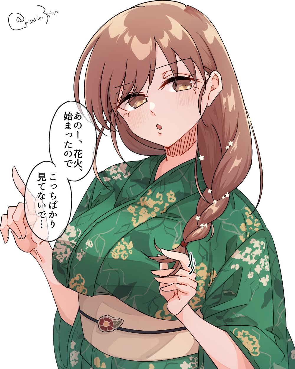 1girl blush braid breasts brown_eyes brown_hair green_kimono highres japanese_clothes kantai_collection kimono long_hair long_sleeves looking_at_viewer matsunaga_(haku) medium_breasts obi ooi_(kancolle) sash solo speech_bubble twitter_username upper_body white_background wide_sleeves