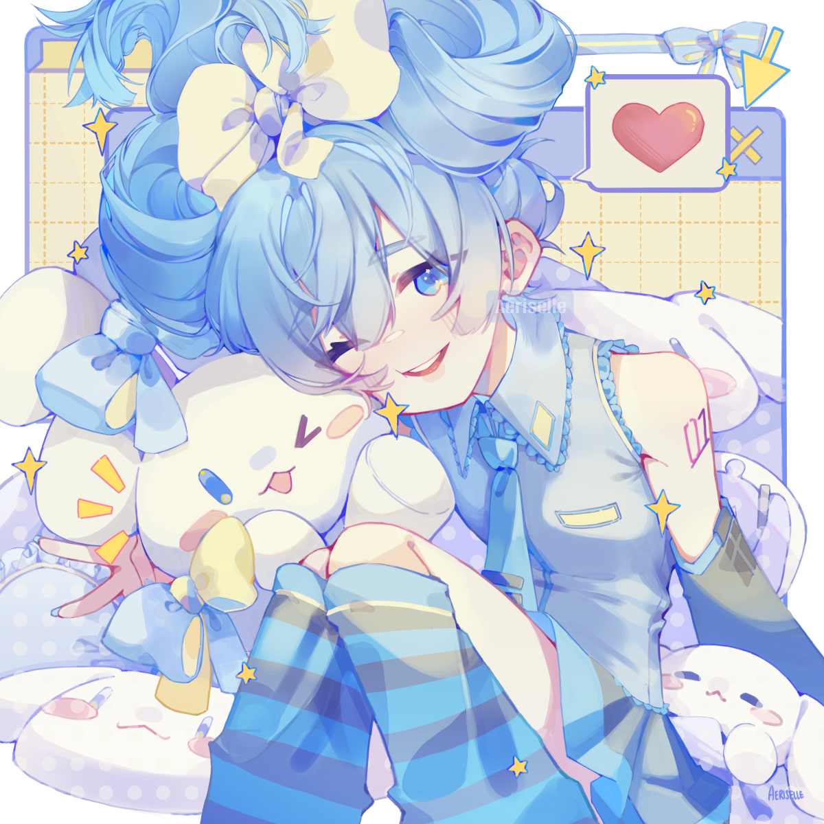 1girl :3 aeriselle arm_tattoo artist_name blue_bow blue_eyes blue_hair blue_nails blue_necktie blush_stickers border bow cinnamiku collared_shirt commentary cursor detached_sleeves english_commentary fuwa_fuwa_cinnamoroll grey_shirt hair_bow hatsune_miku heart highres leg_warmers long_hair looking_at_viewer necktie number_tattoo open_mouth pillow pleated_skirt ribbon sanrio shirt sitting skirt sleeveless sleeveless_shirt smile spoken_heart star_(symbol) striped_leg_warmers striped_ribbon tattoo tie_clip updo v vocaloid white_border yellow_bow