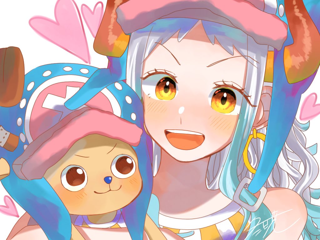 1boy 1girl blue_hair blue_nose commentary_request cross earrings hat heart hood horns jewelry looking_at_another looking_at_viewer n_fuyuakatsuki one_piece open_mouth sidelocks signature smile tony_tony_chopper upper_body white_hair yamato_(one_piece)