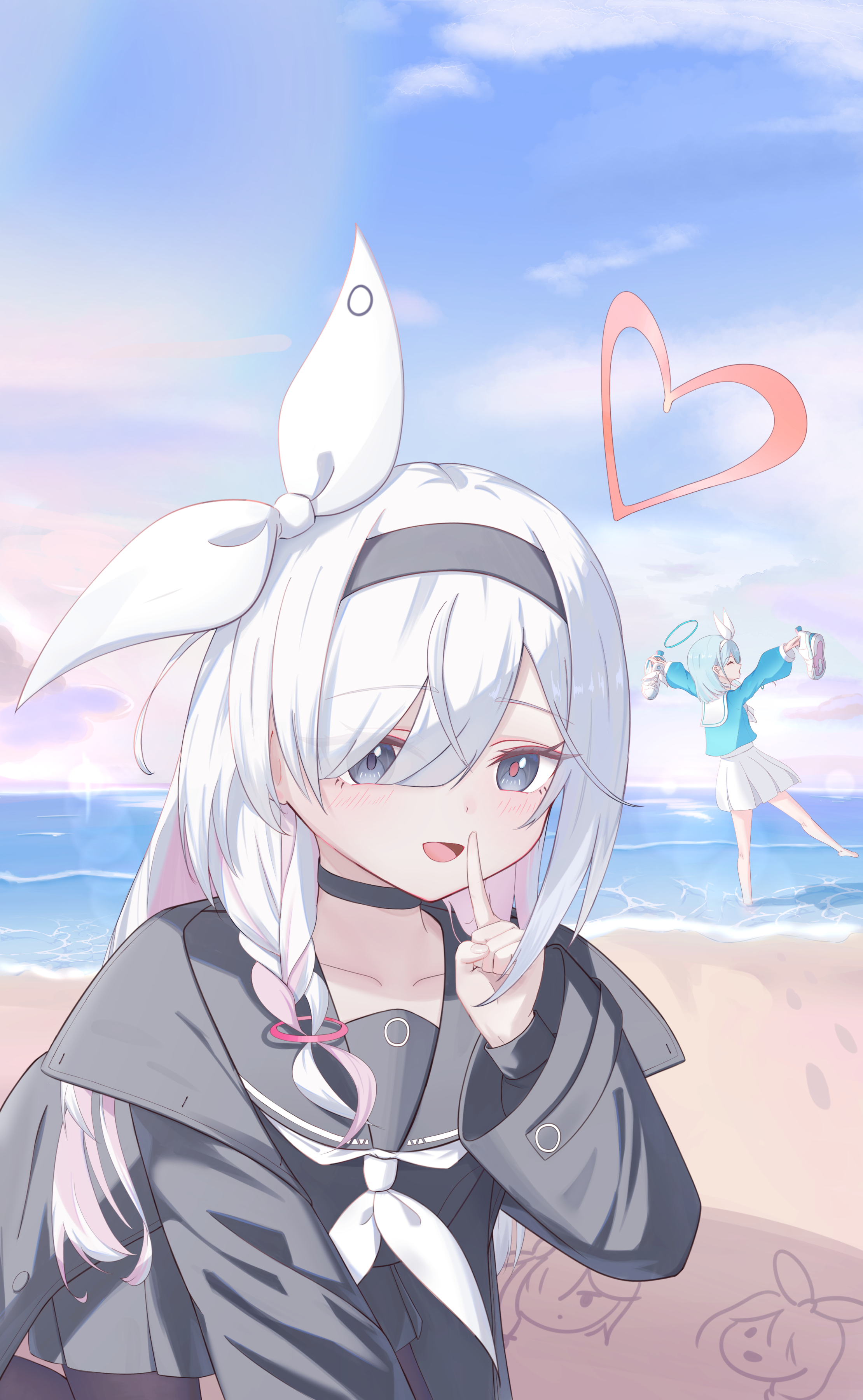 2girls :d absurdres all_fours arona_(blue_archive) barefoot beach black_choker black_hairband black_sailor_collar black_serafuku black_shirt black_skirt blue_archive blue_hair blue_halo blue_shirt blue_sky blunt_bangs blush bow braid choker colored_inner_hair commentary day dere_mono_j eyelashes finger_to_mouth grey_eyes grey_hair hair_bow hair_over_one_eye hairband halo hand_up happy heart heart_halo highres holding holding_shoes holding_unworn_clothes index_finger_raised long_bangs long_hair looking_at_viewer miniskirt multicolored_hair multiple_girls neckerchief ocean open_mouth outdoors pink_hair plana_(blue_archive) pleated_skirt red_halo sailor_collar sand_writing school_uniform serafuku shirt shoes short_hair shushing sidelighting single_braid skirt sky smile solo_focus standing standing_on_one_leg straight_hair tsurime unworn_shoes white_bow white_neckerchief white_sailor_collar white_skirt