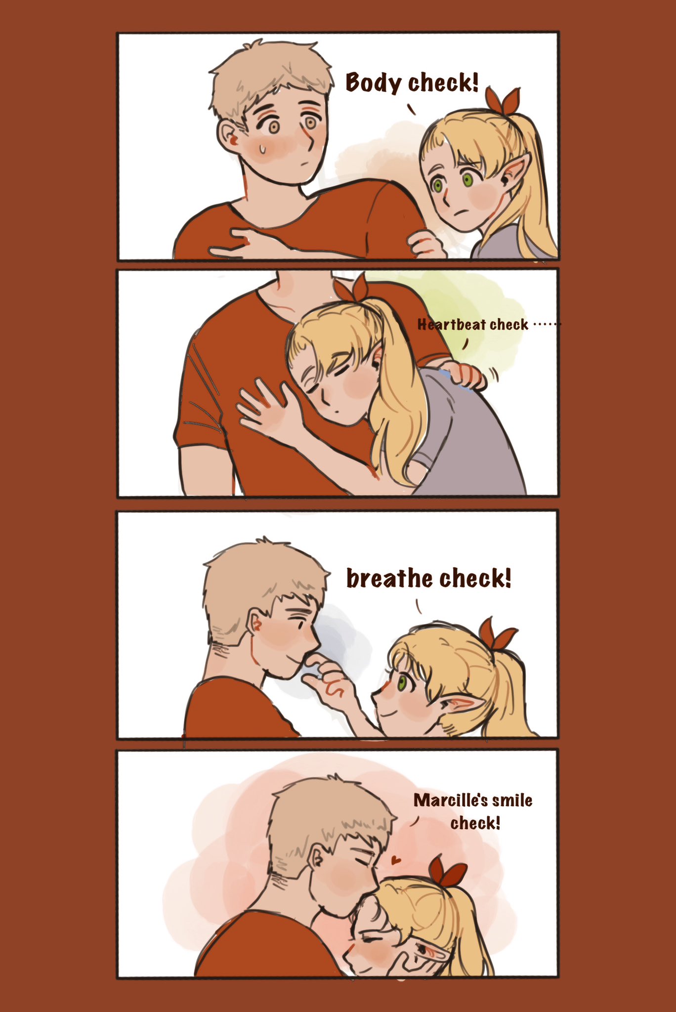 1boy 1girl blonde_hair blush border bow comic contemporary dungeon_meshi elf english_text green_eyes hair_bow hetero highres hug kiss kissing_forehead laios_touden marcille_donato pointy_ears ponytail red_border shirt smile sweatdrop t-shirt upper_body yellow_eyes yuseidungeon