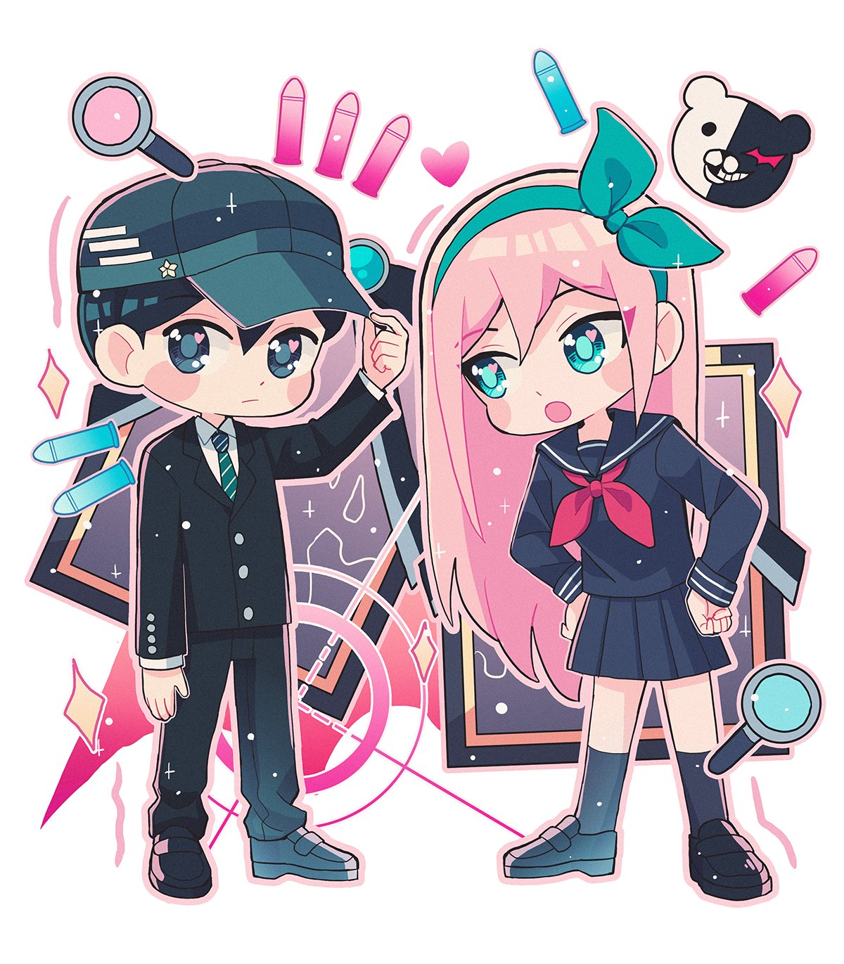 1boy 1girl adjusting_clothes adjusting_headwear akamatsu_kaede akamatsu_kaede_(cosplay) aqua_eyes aqua_hairband aqua_hat arm_at_side aubrey_(faraway)_(omori) aubrey_(omori) black_eyes black_footwear black_hair black_jacket black_pants black_sailor_collar black_serafuku black_shirt black_skirt black_socks bow_hairband bright_pupils buttons cheer_(cheerpuppy14) chibi chibi_only closed_mouth collared_shirt commentary cosplay danganronpa_(series) danganronpa_v3:_killing_harmony diagonal-striped_clothes diagonal-striped_necktie double-parted_bangs english_commentary full_body green_necktie hair_behind_ear hair_between_eyes hairband hands_on_own_hips hat heart heart_in_eye highres jacket lapels layered_sleeves loafers long_hair long_sleeves looking_at_another looking_at_viewer magnifying_glass miniskirt monokuma neckerchief necktie notched_lapels omori open_mouth outline pants pink_hair pink_outline pleated_skirt portrait_(object) red_neckerchief saihara_shuichi saihara_shuichi_(cosplay) sailor_collar school_uniform serafuku shirt shoes short_hair simple_background skirt socks sparkle standing straight_hair striped_clothes sunny_(omori) symbol_in_eye white_background white_shirt