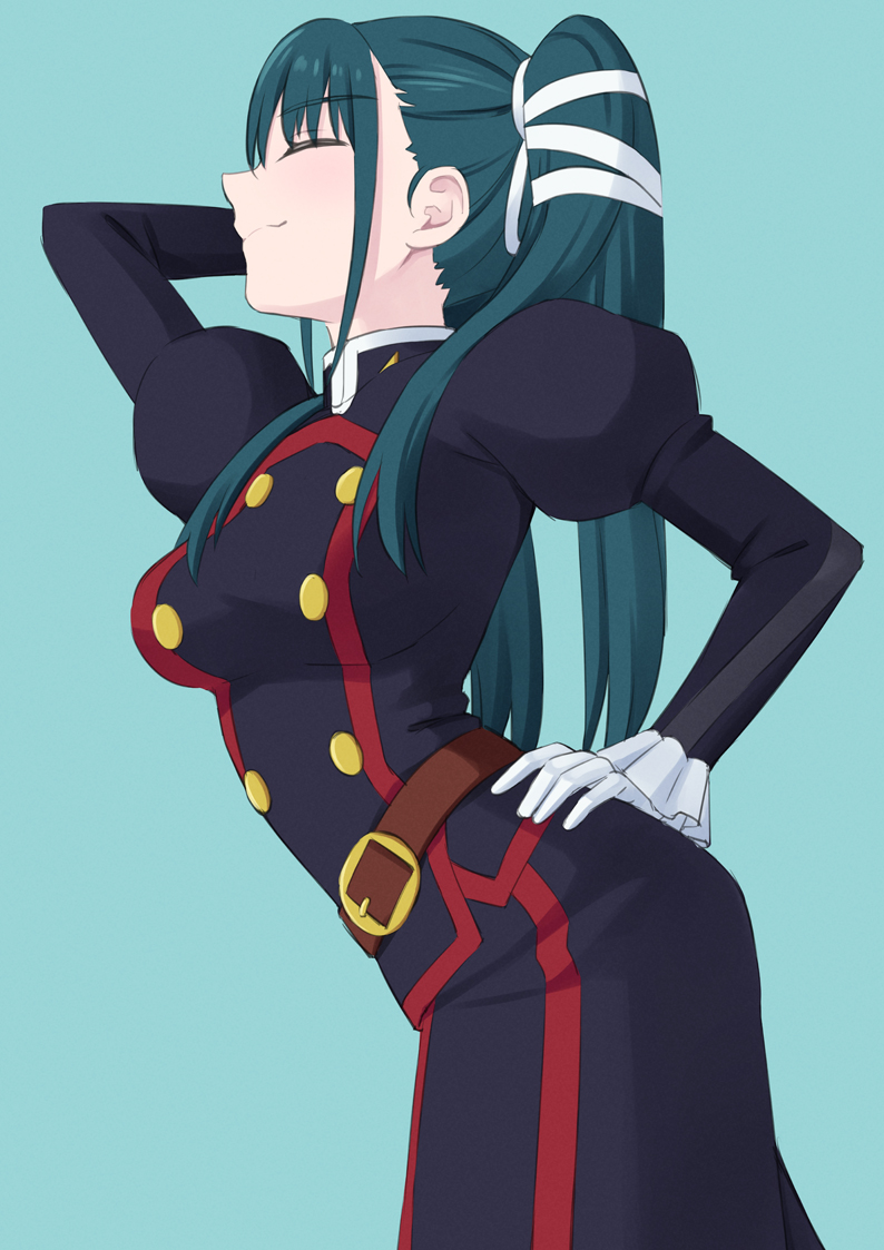 1girl anti-demon_corps_uniform aqua_background arm_up azuma_yachiho belt blue_jacket blue_skirt brown_belt closed_eyes closed_mouth easy_(aqk7bdqt) gloves green_hair hair_ribbon hand_on_own_hip jacket long_hair long_sleeves mato_seihei_no_slave puffy_long_sleeves puffy_sleeves ribbon simple_background skirt smile solo twintails white_gloves