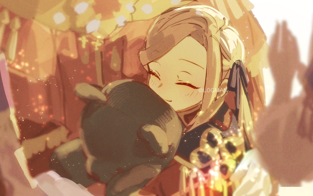 aged_down artist_name blurry blurry_background brown_hair closed_eyes closed_mouth collared_shirt commentary_request edelgard_von_hresvelg edelgard_von_hresvelg_(young) fire_emblem fire_emblem:_three_houses from_side hair_ribbon holding holding_stuffed_toy l0gman light_smile long_hair long_sleeves nintendo purple_ribbon ribbon shirt standing stuffed_animal stuffed_toy teddy_bear twintails twitter_username watermark