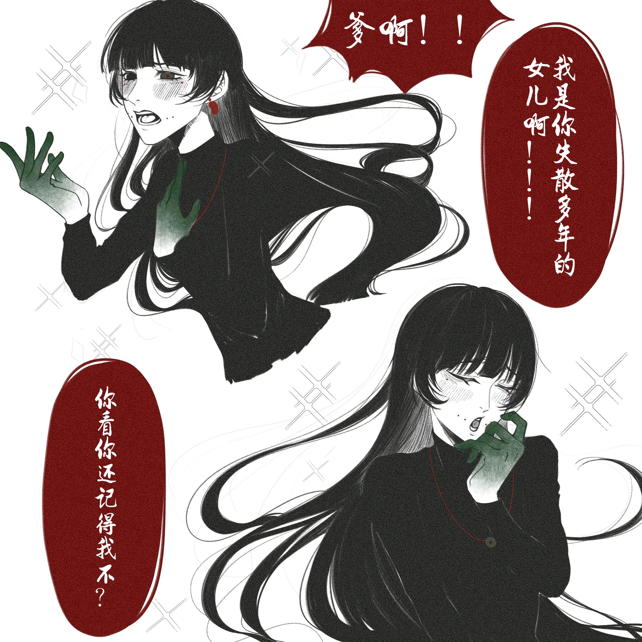 1girl black_hair black_shirt blunt_bangs blush chinese_commentary chinese_text closed_eyes colored_extremities colored_skin commentary_request facial_mark film_grain green_eyes hand_on_own_chest heterochromia highres long_hair long_sleeves male_focus multiple_views naihe_(female)_(touqi_guaitan) nairuohe438 open_mouth shirt simple_background sparkle touqi_guaitan translation_request white_background white_skin