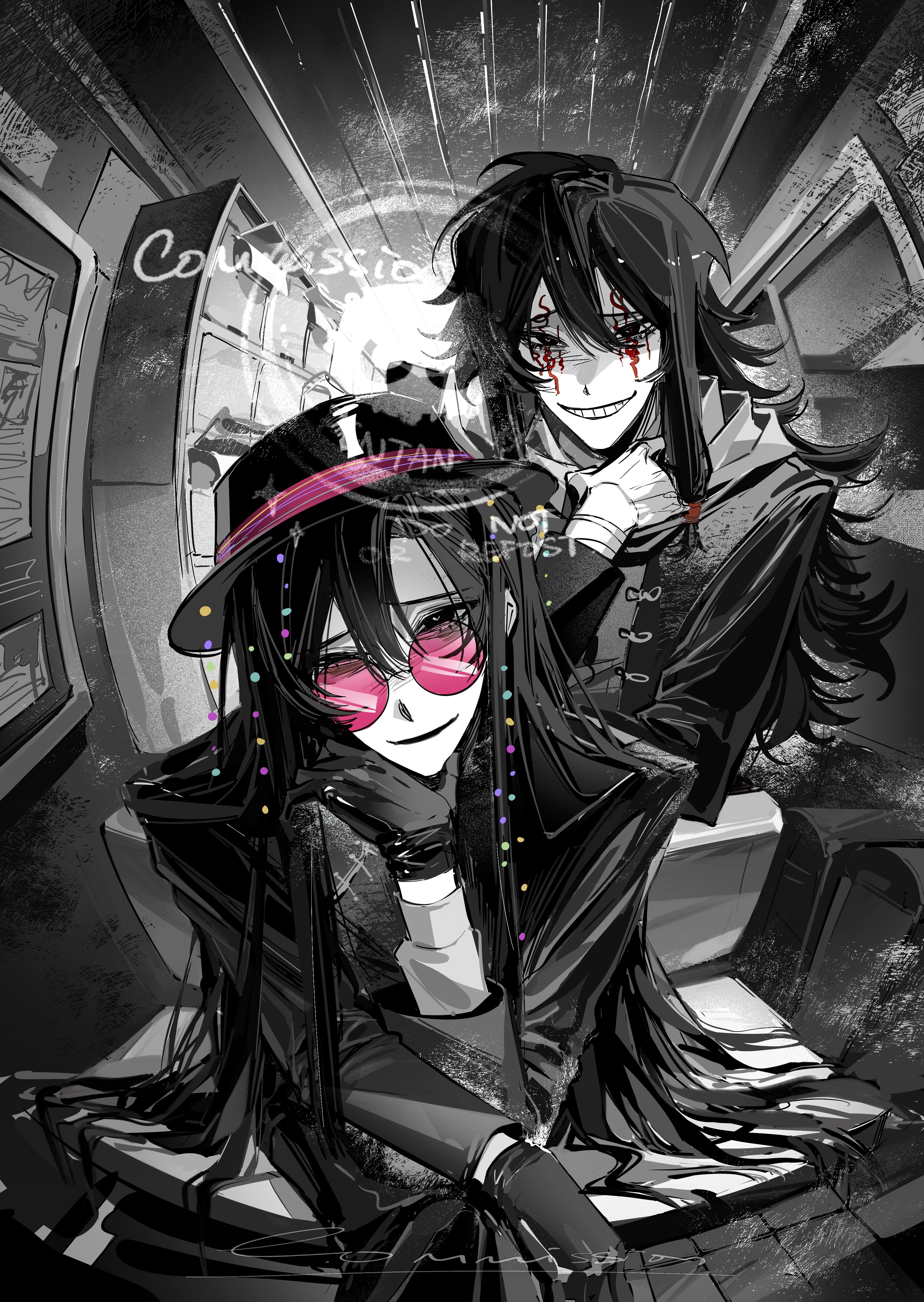 2boys absurdres beads chinese_commentary commentary_request commission facial_tattoo gloves glugluglucose greyscale grin hat highres huai_yunqing long_hair long_sleeves male_focus monochrome multiple_boys open_mouth pink-tinted_eyewear round_eyewear scarf smile spot_color tattoo tinted_eyewear touqi_guaitan watermark ziche_fuzhao