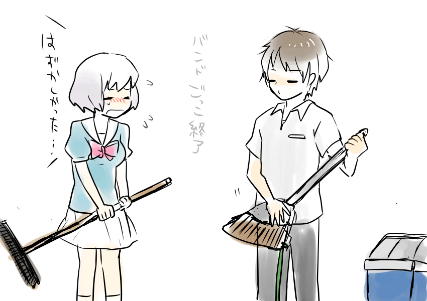 1boy 1girl =_= band_(music) black_pants blue_shirt blush bob_cut bow bowtie breast_pocket breasts broom broom_guitar brown_hair closed_eyes closed_mouth collared_shirt commentary embarrassed eye_contact flustered flying_sweatdrops furrowed_brow holding holding_broom kneehighs looking_at_another medium_breasts nante_kottai nose_blush open_mouth pants pink_bow pink_bowtie playing pleated_skirt pocket puffy_short_sleeves puffy_sleeves pursed_lips rope sailor_collar school_uniform seki_toshinari serafuku shirt short_hair short_sleeves side-by-side sketch skirt socks standing tonari_no_seki-kun translated trash_can unconventional_guitar white_background white_hair white_sailor_collar white_shirt white_skirt white_socks yokoi_rumi