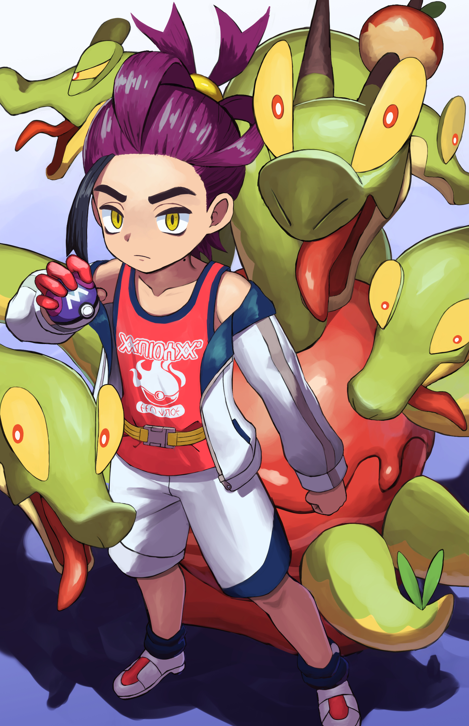 1boy absurdres black_hair closed_mouth commentary_request highres holding holding_poke_ball hydrapple jacket jira_(ziraiya26) kieran_(pokemon) knees male_focus master_ball multicolored_hair nintendo off_shoulder poke_ball pokemon pokemon_(creature) pokemon_scarlet_and_violet purple_hair red_shirt shirt shoes shorts sleeveless sleeveless_shirt standing two-tone_hair white_footwear white_jacket white_shorts yellow_eyes