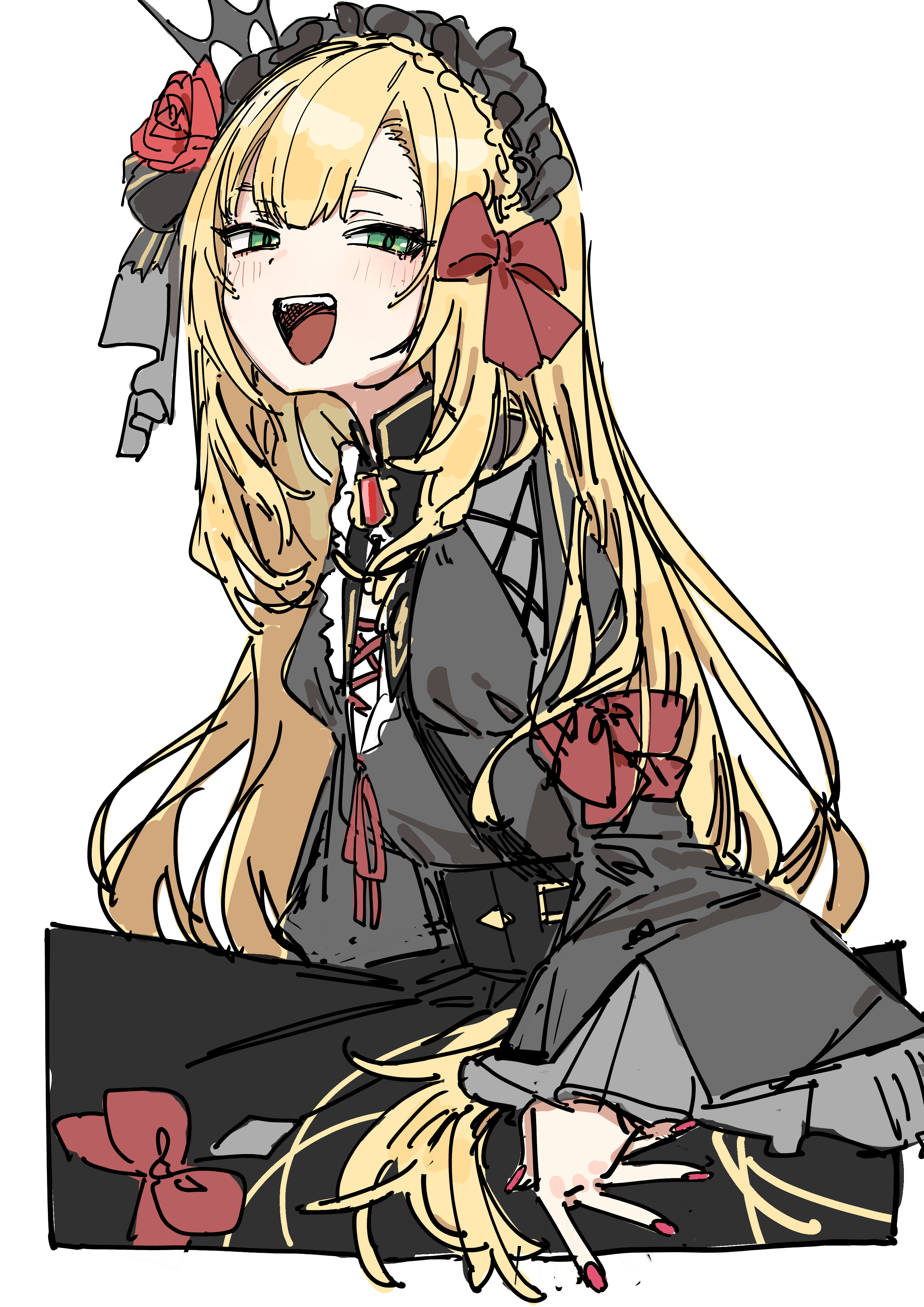 1boy :d absurdres black_dress blonde_hair bow crossdressing crossdressing_(mtf) crown dress flower from_side gothic_lolita green_eyes hair_bow hair_flower hair_ornament hairband haruyuki_(gffewuoutgblubh) highres lolita_fashion lolita_hairband long_hair long_sleeves looking_at_viewer male_focus mini_crown narrowed_eyes nijisanji open_mouth pink_nails red_bow red_flower simple_background smile solo teeth trap upper_teeth_only uzuki_kou uzuki_kou_(4th_costume) very_long_hair virtual_youtuber white_background