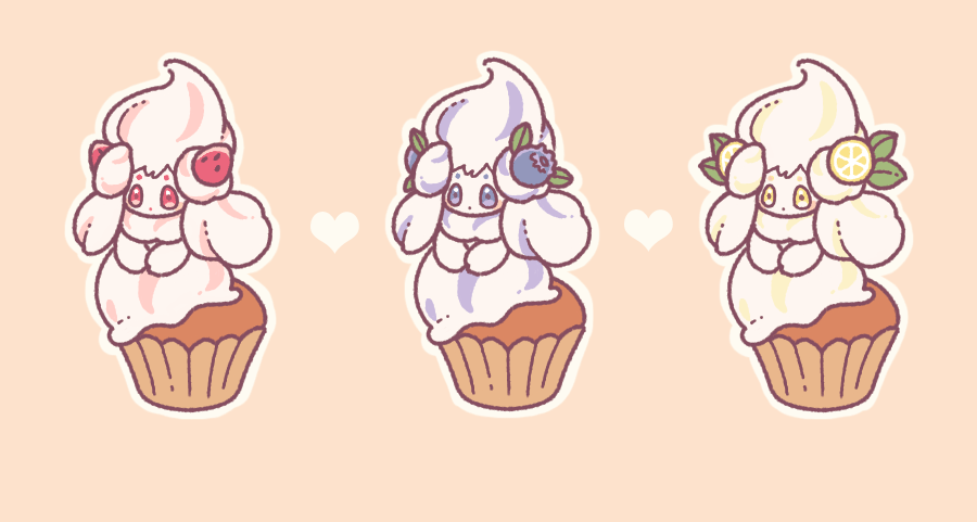 alcremie alcremie_(berry_sweet) alcremie_(lemon_cream) alcremie_(strawberry_sweet) blue_eyes blueberry closed_mouth cupcake dot_mouth food food_focus fruit gen_8_pokemon heart lemon lemon_slice nintendo no_humans outline pink_background pokemon pokemon_(creature) red_eyes satsumapotato simple_background white_outline