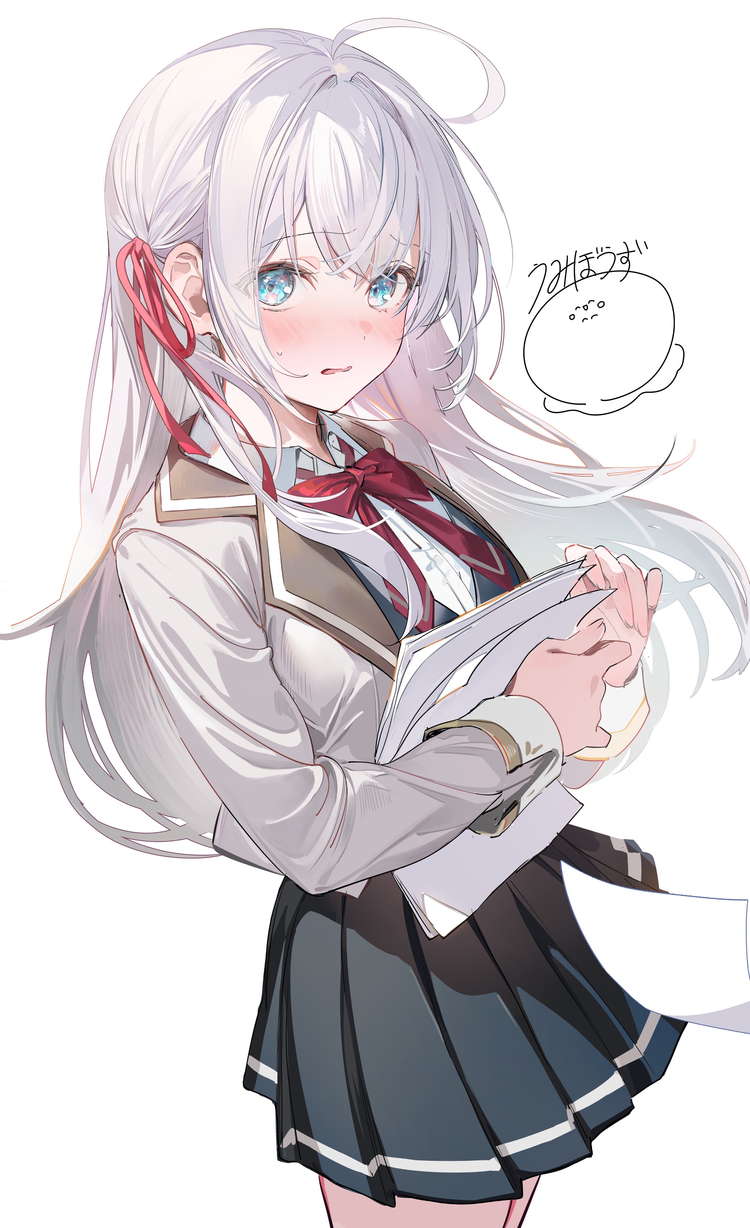 1girl absurdres ahoge alisa_mikhailovna_kujou black_skirt blue_eyes blush collared_shirt floating_hair grey_hair grey_jacket hair_between_eyes hair_ribbon highres holding holding_paper jacket long_hair long_sleeves open_clothes open_jacket paper parted_lips red_ribbon ribbon school_uniform shirt signature simple_background skirt solo standing sweat tokidoki_bosotto_roshia-go_de_dereru_tonari_no_alya-san umibouzu_(niito) white_background white_shirt