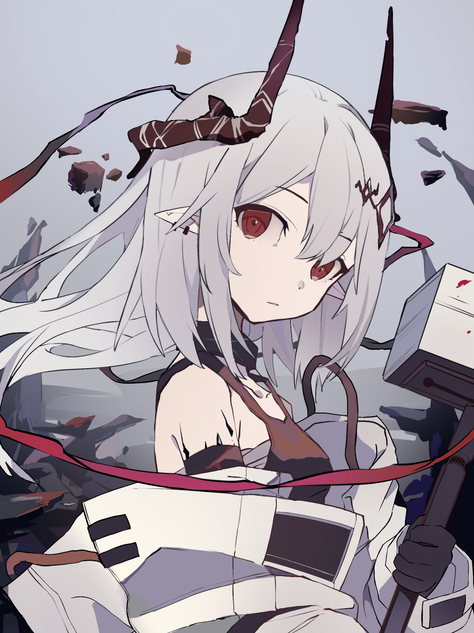 1girl arknights debris gloves grey_hair hammer highres holding holding_hammer holding_weapon horns jta4 jumpsuit long_hair looking_at_viewer looking_to_the_side mudrock_(arknights) mudrock_(elite_ii)_(arknights) pale_skin pointy_ears red_eyes red_horns sledgehammer solo upper_body weapon