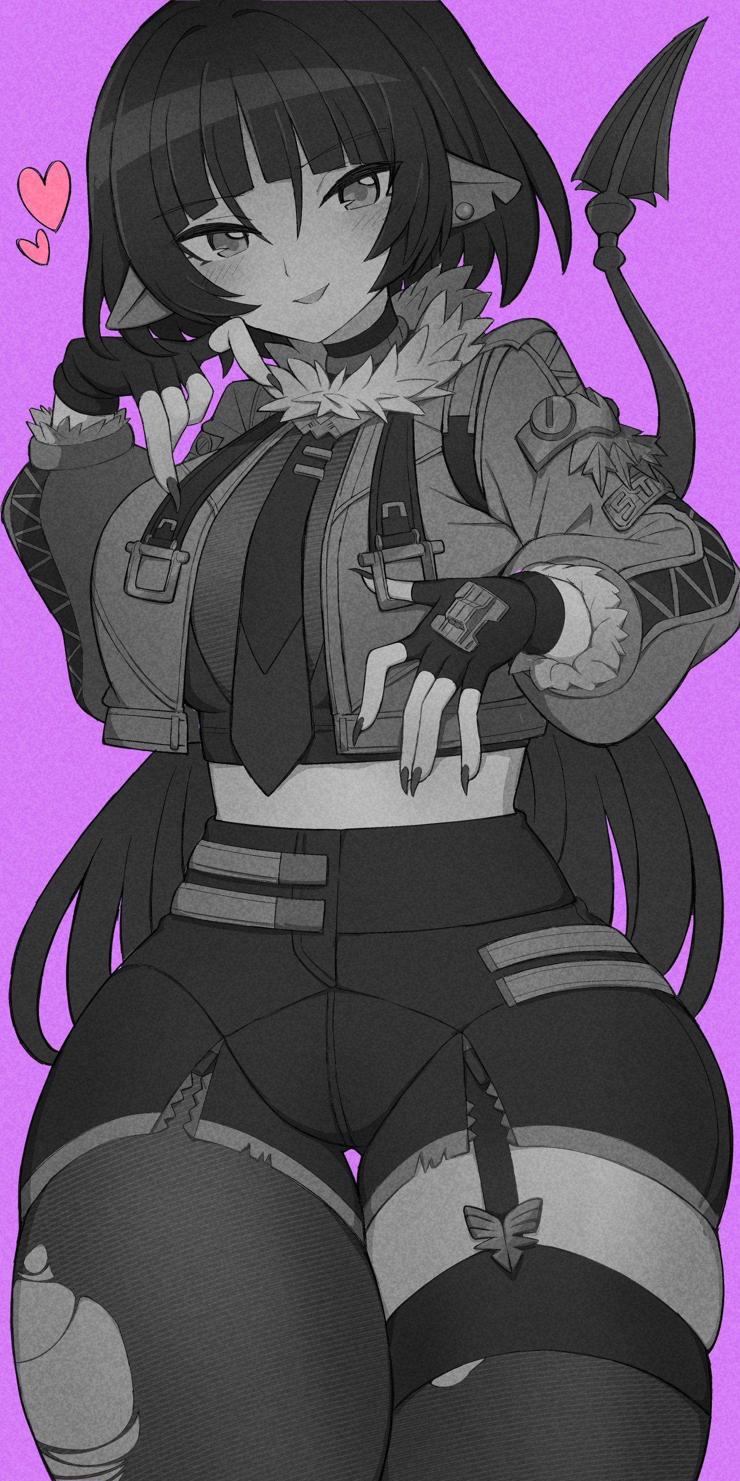 1girl absurdres animal_ear_piercing animal_ears asymmetrical_legwear black_gloves black_hair blunt_bangs breasts crop_top fingerless_gloves garter_straps gloves greyscale heart high-waist_shorts highres jacket jane_doe_(zenless_zone_zero) long_hair looking_at_viewer mismatched_legwear monochrome mouse_ears mouse_girl mouse_tail nishitin pantyhose purple_background shirt shorts simple_background single_garter_strap single_leg_pantyhose single_thighhigh smile solo tail thighhighs torn_clothes torn_pantyhose turtleneck turtleneck_shirt uneven_legwear zenless_zone_zero