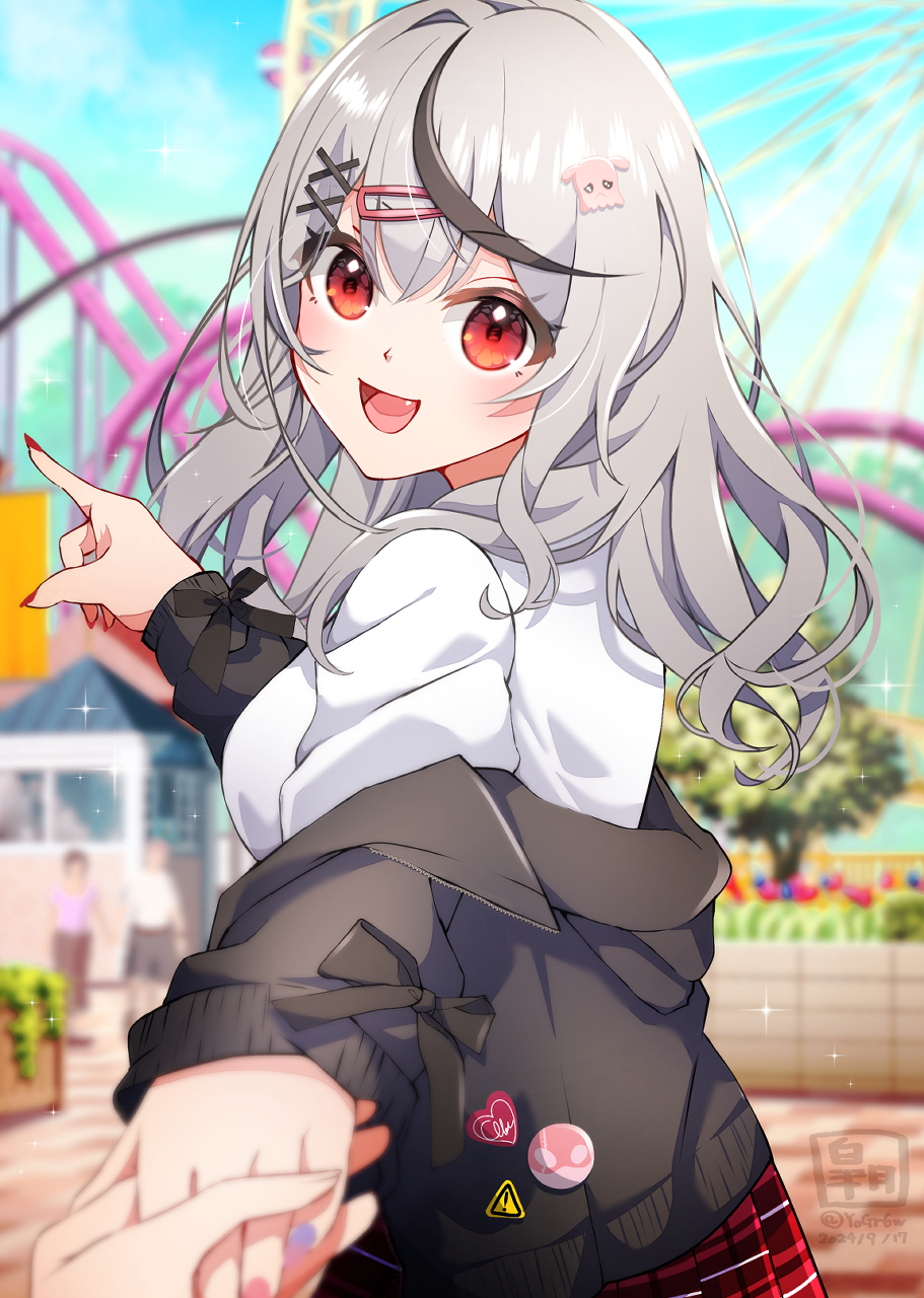 1girl 1other :d black_hair black_jacket dated grey_hair hair_ornament hairclip highres holding_hands hololive jacket long_hair multicolored_hair off_shoulder official_alternate_costume open_clothes open_jacket open_mouth red_eyes red_skirt sakamata_chloe sakamata_chloe_(gyarumata) satsuki_(pixiv_742410) shirt skirt smile streaked_hair virtual_youtuber white_shirt x_hair_ornament