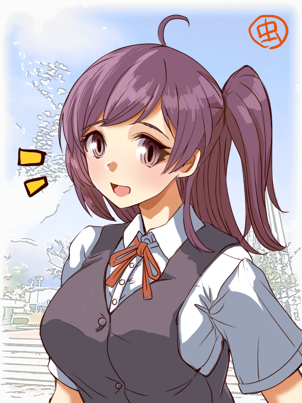 1girl ahoge blue_background blush breasts brown_eyes gloves hagikaze_(kancolle) kantai_collection long_hair looking_at_viewer medium_breasts mushi_mushi_ex neck_ribbon one_side_up open_mouth purple_hair red_ribbon ribbon shirt short_sleeves skirt smile solo upper_body vest white_gloves white_shirt