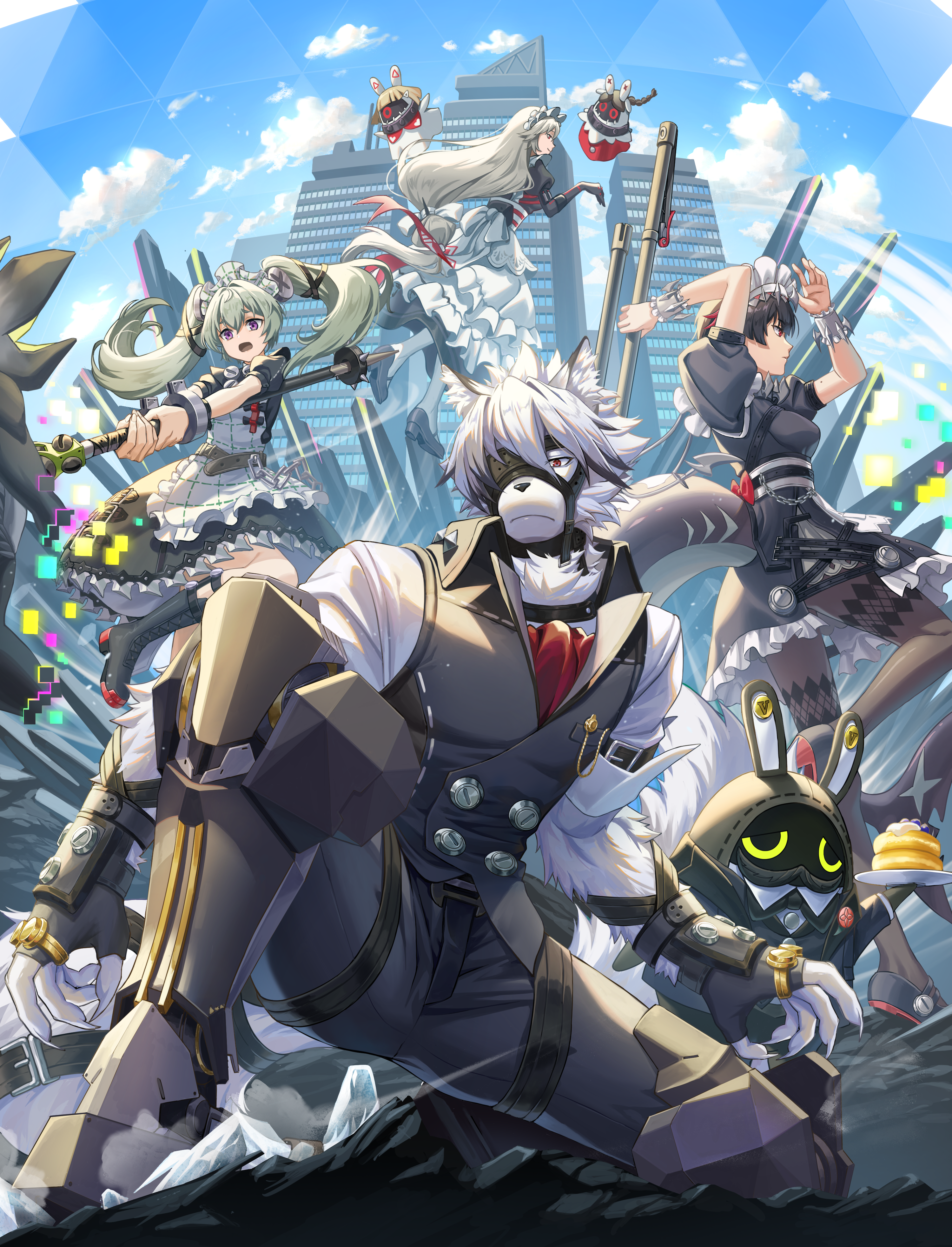 absurdres alexandrina_sebastiane anastella_(zenless_zone_zero) animal_ear_fluff animal_ears apron arm_belt bangboo_(zenless_zone_zero) black_gloves black_hair body_fur butler_(zenless_zone_zero) closed_mouth corin_wickes dero_(eka56921) dress drusilla_(zenless_zone_zero) ellen_joe fins fish_tail furry furry_male furry_with_non-furry gloves green_hair grey_vest hair_between_eyes hair_ornament hairband highres holding interspecies long_hair long_sleeves looking_at_viewer low-tied_long_hair maid maid_apron maid_headdress metal_hairband mole mole_under_eye multicolored_hair multiple_girls muzzle_(mask) open_mouth pantyhose puffy_short_sleeves puffy_sleeves purple_eyes red_eyes red_hair red_nails scar scar_on_tail screw_hair_ornament shark_girl shark_tail shirt short_hair short_sleeves smile tail tail_belt twintails two-tone_hair very_long_hair vest von_lycaon white_apron white_fur white_hair wolf_boy wolf_ears wolf_tail zenless_zone_zero