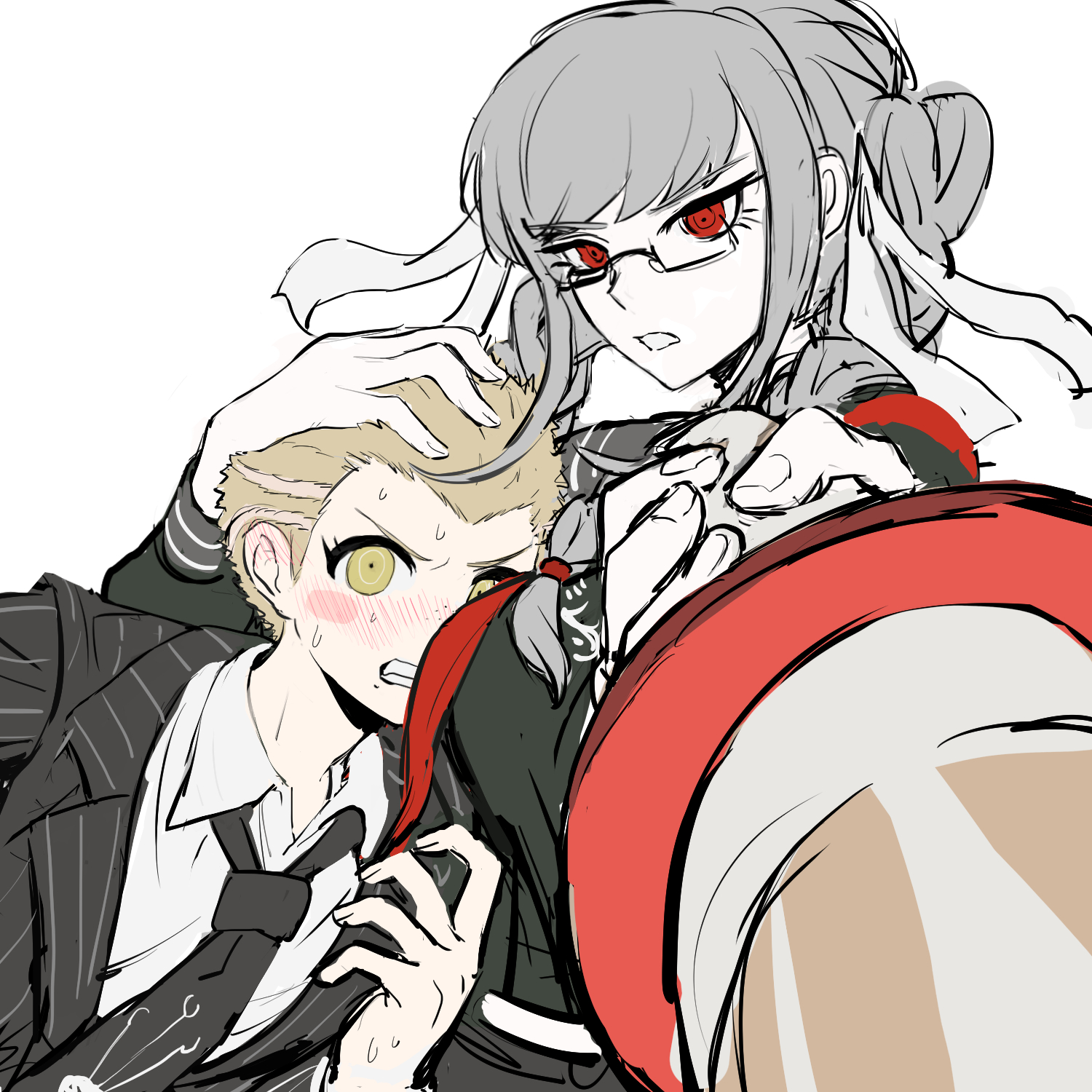 1boy 1girl black_jacket black_necktie black_shirt blonde_hair blush braid breasts casssstle12 collared_shirt danganronpa_(series) danganronpa_2:_goodbye_despair glasses grey_hair hair_ribbon hand_on_another's_head highres holding holding_weapon jacket kuzuryu_fuyuhiko large_breasts necktie pekoyama_peko red_eyes ribbon rimless_eyewear shirt short_hair simple_background striped_clothes striped_jacket teeth twin_braids twintails weapon white_ribbon white_shirt yellow_eyes