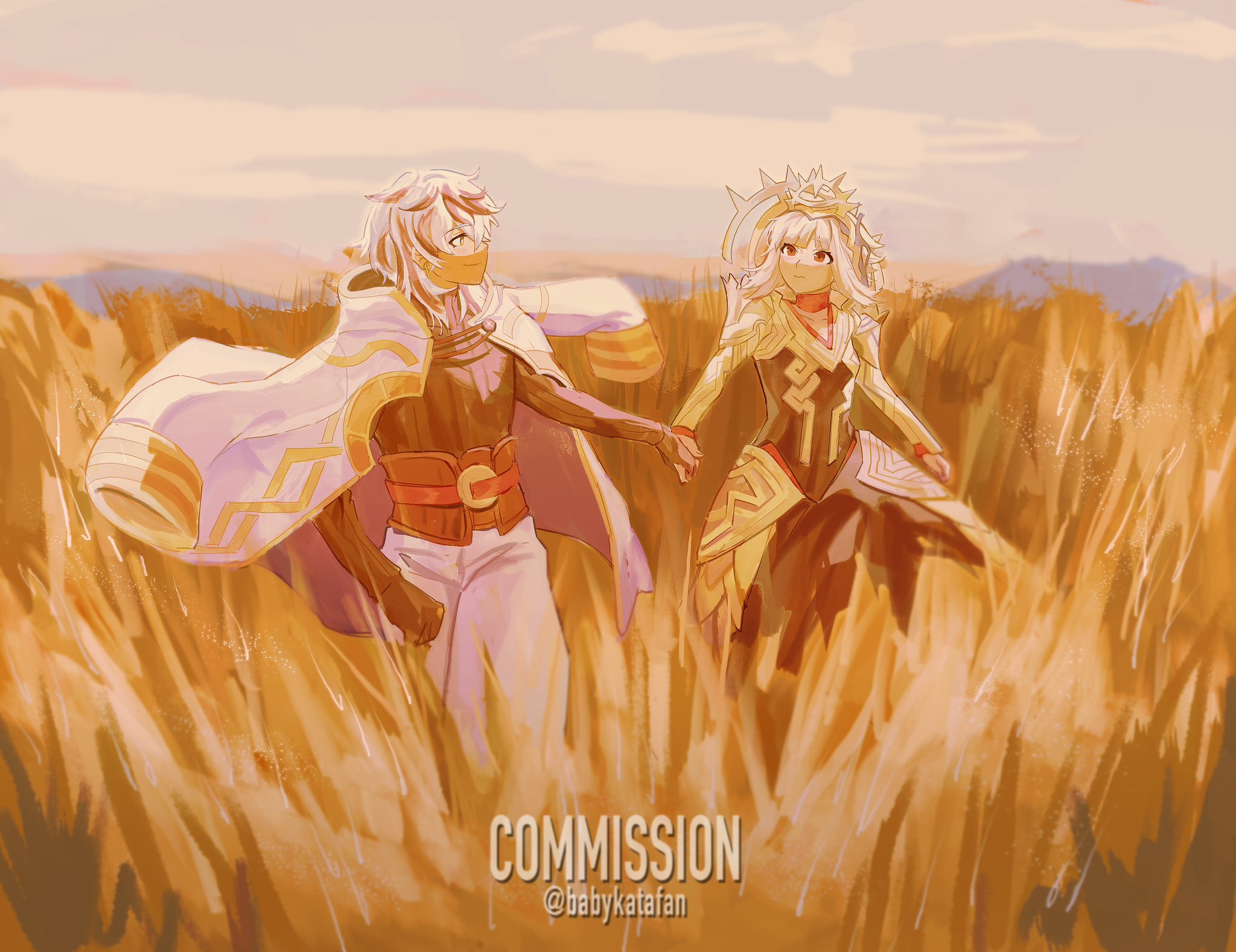 1boy 1girl babykatafan choker commission cosplay dress fire_emblem fire_emblem_heroes grey_hair highres holding_hands jacket kiran_(fire_emblem) kiran_(fire_emblem)_(cosplay) looking_at_another multicolored_hair nintendo official_alternate_costume official_alternate_hairstyle open_clothes open_jacket original outdoors red_eyes short_hair_with_long_locks tiara twitter_username two-tone_hair veronica_(fire_emblem) veronica_(princess_rising)_(fire_emblem) vgen_commission wheat_field white_hair