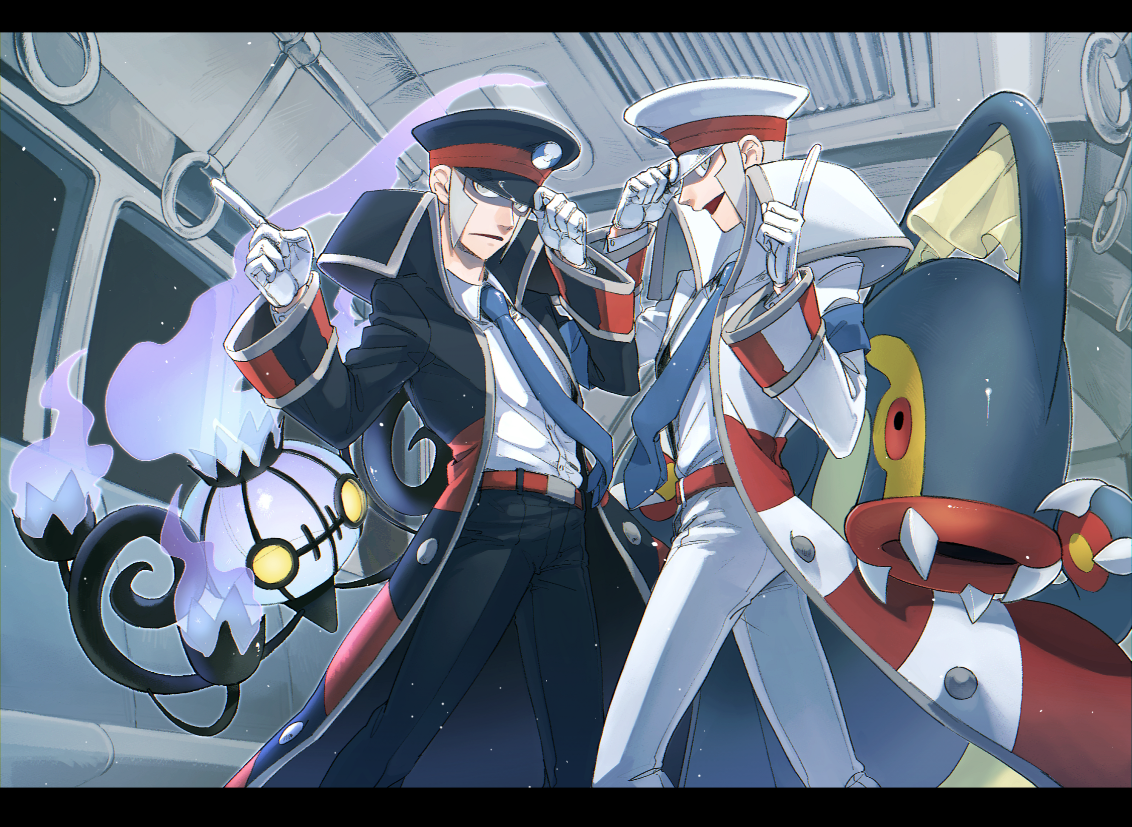 2boys :d adjusting_clothes adjusting_headwear akamtvahosi armband belt black_coat black_hat black_pants blue_armband blue_necktie brothers buttons chandelure coat collared_coat collared_shirt commentary_request eelektross emmet_(pokemon) fangs fire frown gen_5_pokemon grey_eyes grey_hair hand_grip hand_on_headwear hands_up hat highres index_finger_raised ingo_(pokemon) letterboxed light_particles long_sleeves looking_at_viewer male_focus multiple_boys necktie nintendo open_clothes open_coat open_mouth pants peaked_cap pokemon pokemon_(creature) pokemon_black_and_white purple_fire red_belt red_eyes shaded_face shirt shirt_tucked_in short_hair siblings sideburns sideways_glance smile standing striped_coat train_interior twins white_coat white_hat white_pants window wing_collar yellow_eyes