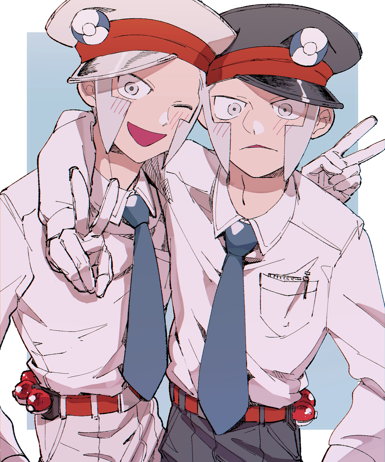 2boys ;d akamtvahosi arm_around_shoulder belt black_hat black_pants blue_background blue_necktie blush border breast_pocket brother_and_sister collared_shirt commentary_request emmet_(pokemon) frown gloves grey_eyes grey_hair hat highres ingo_(pokemon) long_sleeves looking_at_viewer male_focus multiple_boys necktie nintendo one_eye_closed open_mouth outside_border pants peaked_cap pocket poke_ball poke_ball_(basic) pokemon pokemon_black_and_white red_belt shirt shirt_tucked_in short_hair siblings sideburns sideways_hat simple_background smile standing twins v white_border white_gloves white_hat white_pants white_shirt wing_collar