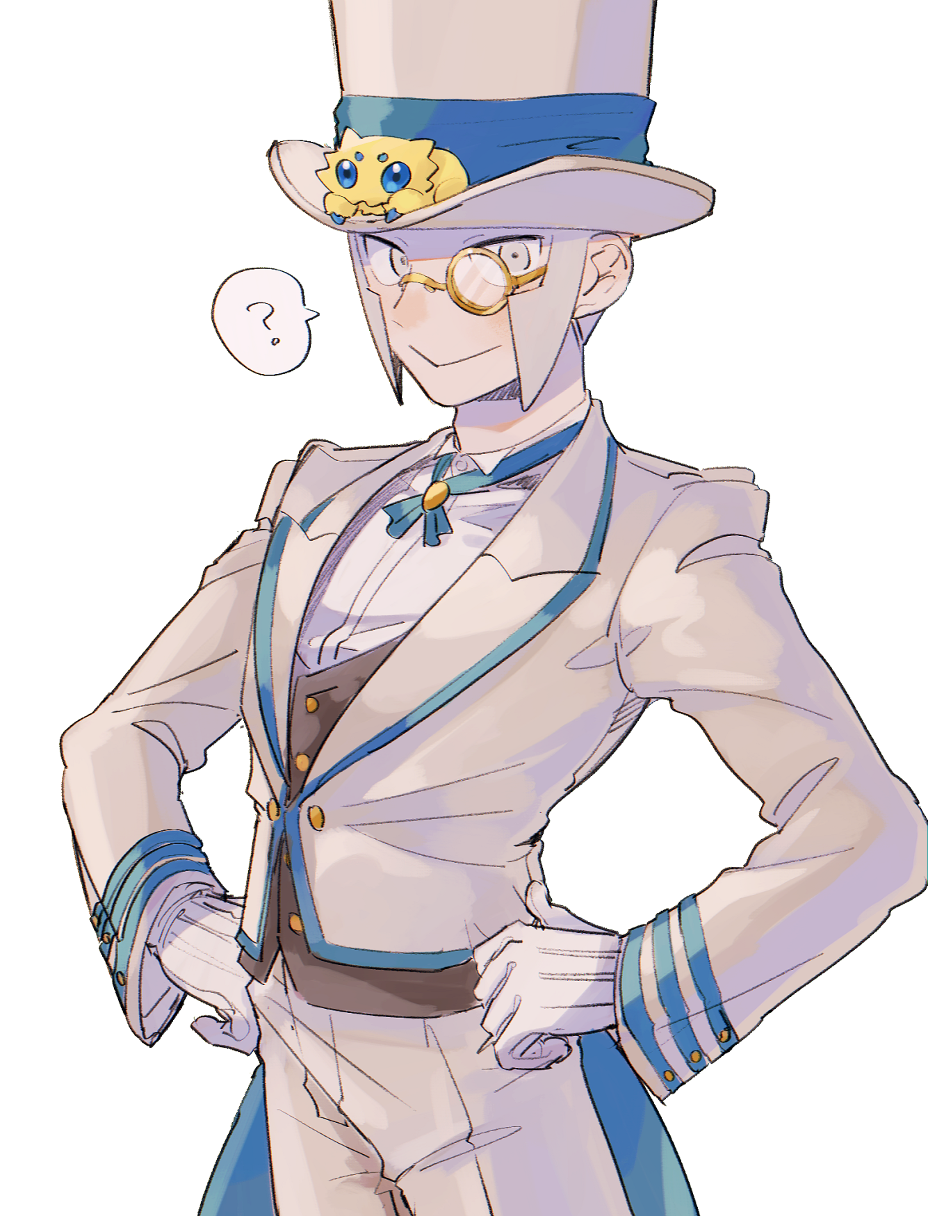 1boy ? akamtvahosi blue_ribbon brooch brown_vest buttons closed_mouth coattails commentary_request cowboy_shot emmet_(pokemon) emmet_(special_costume)_(pokemon) gen_5_pokemon gloves grey_eyes grey_hair grey_hat grey_jacket grey_pants hands_on_own_hips hat highres jacket jewelry joltik lapels long_sleeves looking_at_viewer male_focus monocle neck_ribbon nintendo official_alternate_costume on_head pants pokemon pokemon_(creature) pokemon_masters_ex pokemon_on_head ribbon shirt short_hair sideburns simple_background smile solo speech_bubble spoken_question_mark standing tailcoat top_hat vest white_background white_gloves white_shirt