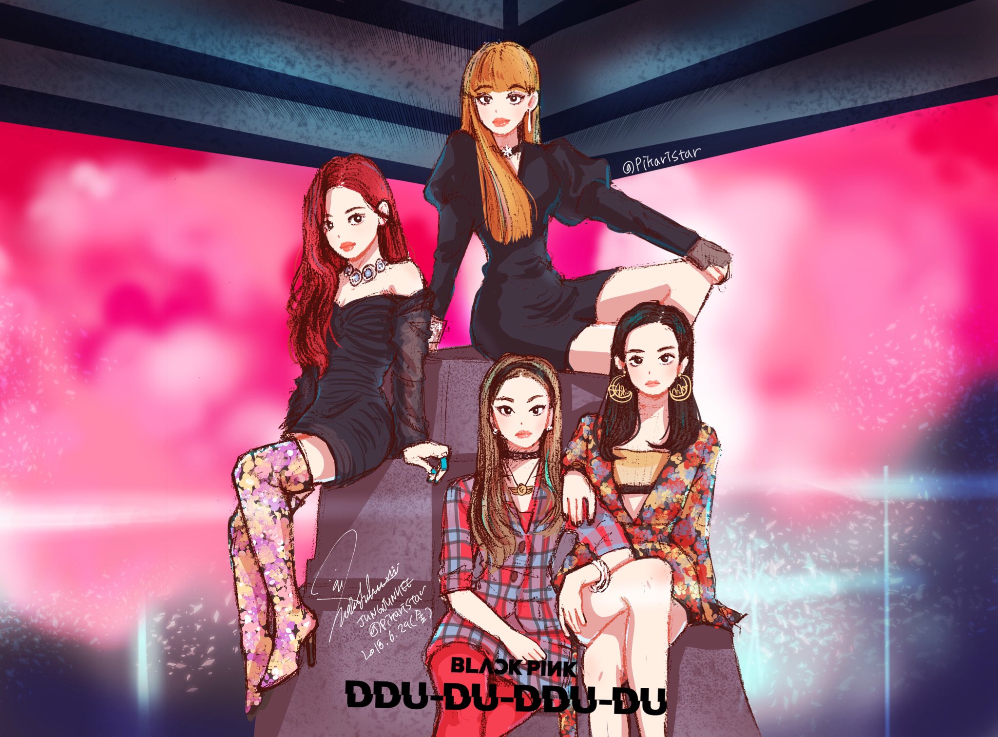 4girls black_dress black_hairband black_nails blackpink blunt_bangs boots bracelet brown_hair choker commentary_request dress earrings hairband high_heel_boots high_heels highres jennie_(blackpink) jewelry jisoo_(blackpink) k-pop korean_commentary lisa_(blackpink) long_hair long_sleeves looking_at_viewer multiple_girls necklace pikaristar puffy_sleeves real_life red_hair rose_(blackpink) sitting thigh_boots twitter_username