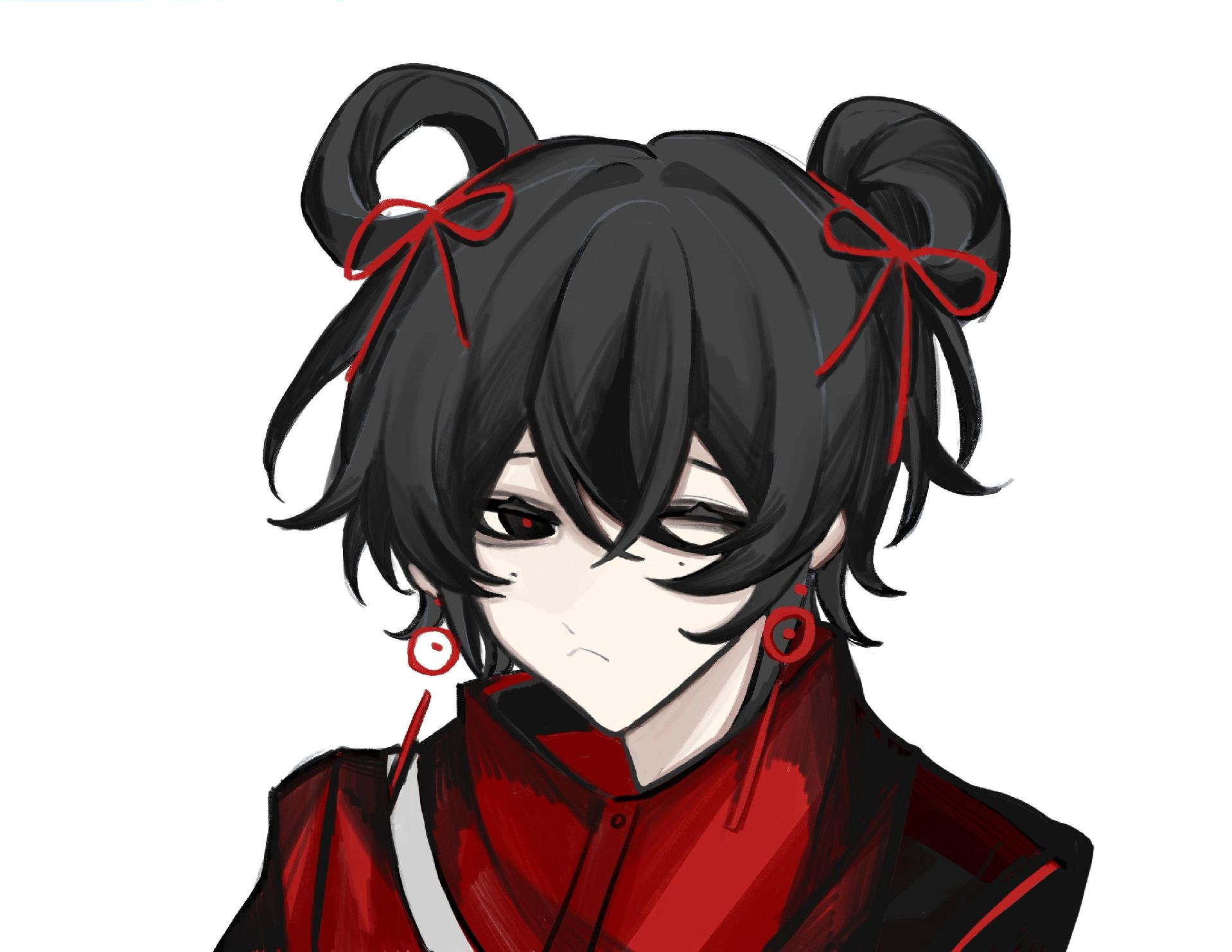 1girl ;( black_eyes black_hair closed_mouth earrings frown hair_between_eyes hair_bun hair_ribbon hair_rings highres jacket jewelry li_yuting_(female) mole mole_under_each_eye mole_under_eye multiple_moles one_eye_closed portrait red_jacket red_pupils red_ribbon ribbon rollzhumo short_hair simple_background single_hair_bun single_hair_ring solo touqi_guaitan white_background