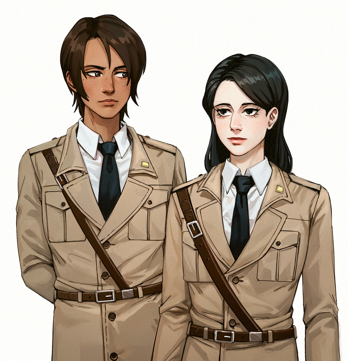 2girls adelheid_(moschiola) alternate_universe arms_behind_back belt black_eyes black_hair black_necktie brown_belt brown_coat brown_eyes brown_hair coat commentary dark-skinned_female dark_skin freckles highres military_uniform multiple_girls necktie pieck_finger shingeki_no_kyojin smile ymir_(shingeki_no_kyojin)