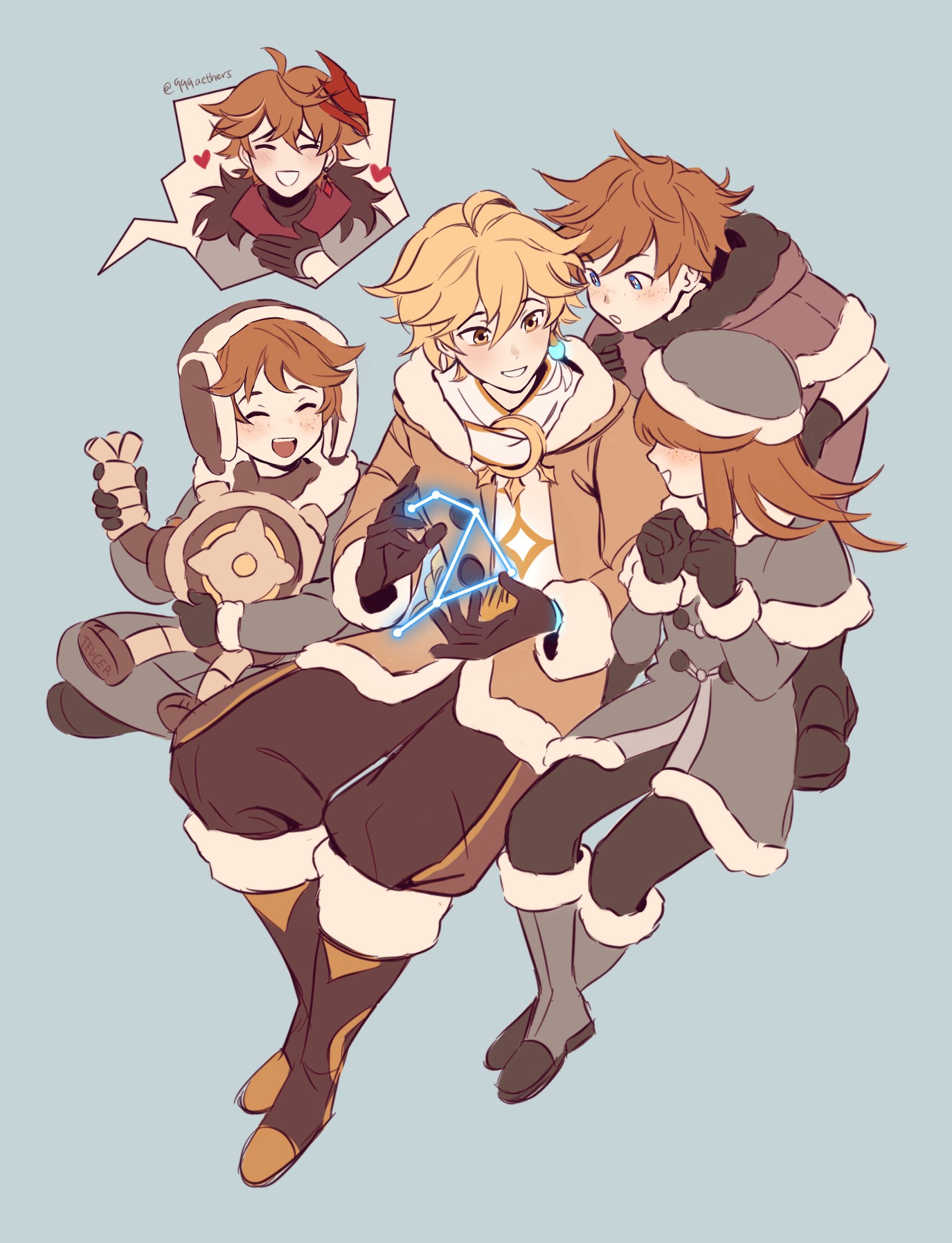 1girl 4boys 999aethers aether_(genshin_impact) ahoge alternate_costume anthon_(genshin_impact) artist_name baggy_pants black_footwear black_gloves black_pants blonde_hair blue_background blue_eyes blush boots brother_and_sister brothers brown_coat brown_footwear brown_gloves brown_hair brown_hat brown_pants buttons child clenched_hands closed_eyes coat commentary constellation crystal_earrings doll earrings english_commentary freckles full_body fur-trimmed_coat fur-trimmed_footwear fur-trimmed_headwear fur_trim genshin_impact gloves grey_coat grey_footwear grey_hat hair_between_eyes hand_on_own_chest hand_on_own_chin hand_up hands_up hat heart highres holding holding_doll jewelry long_hair long_sleeves looking_at_another mask mask_on_head multiple_boys open_mouth pants red_mask red_scarf scarf shoes short_hair short_sleeves siblings simple_background single_earring sitting smile spoken_character standing tartaglia_(genshin_impact) teeth teucer_(genshin_impact) tonia_(genshin_impact) white_scarf winter_clothes yellow_eyes