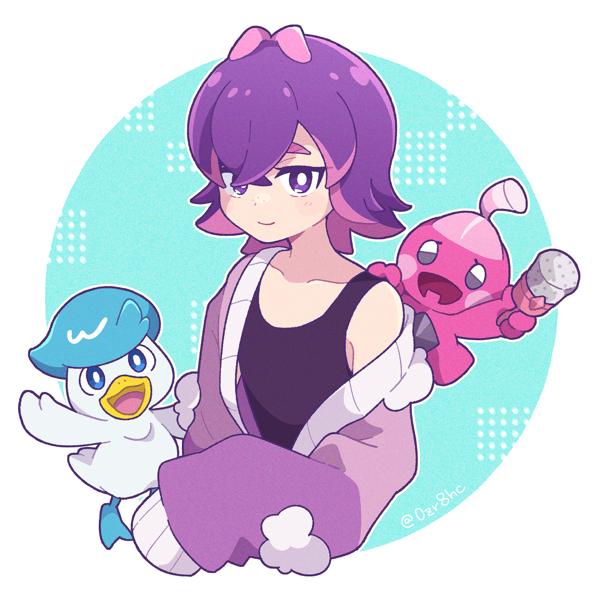 0zr8hc 1girl border bright_pupils cardigan closed_mouth collarbone commentary_request crossed_bangs dot_(pokemon) highres long_sleeves medium_hair multicolored_hair nintendo pink_hair pokemon pokemon_(anime) pokemon_(creature) pokemon_horizons pokemon_on_back purple_cardigan purple_eyes purple_hair quaxly shirt sleeveless sleeveless_shirt sleeves_past_fingers sleeves_past_wrists smile tinkatink twitter_username two-tone_hair white_border white_pupils