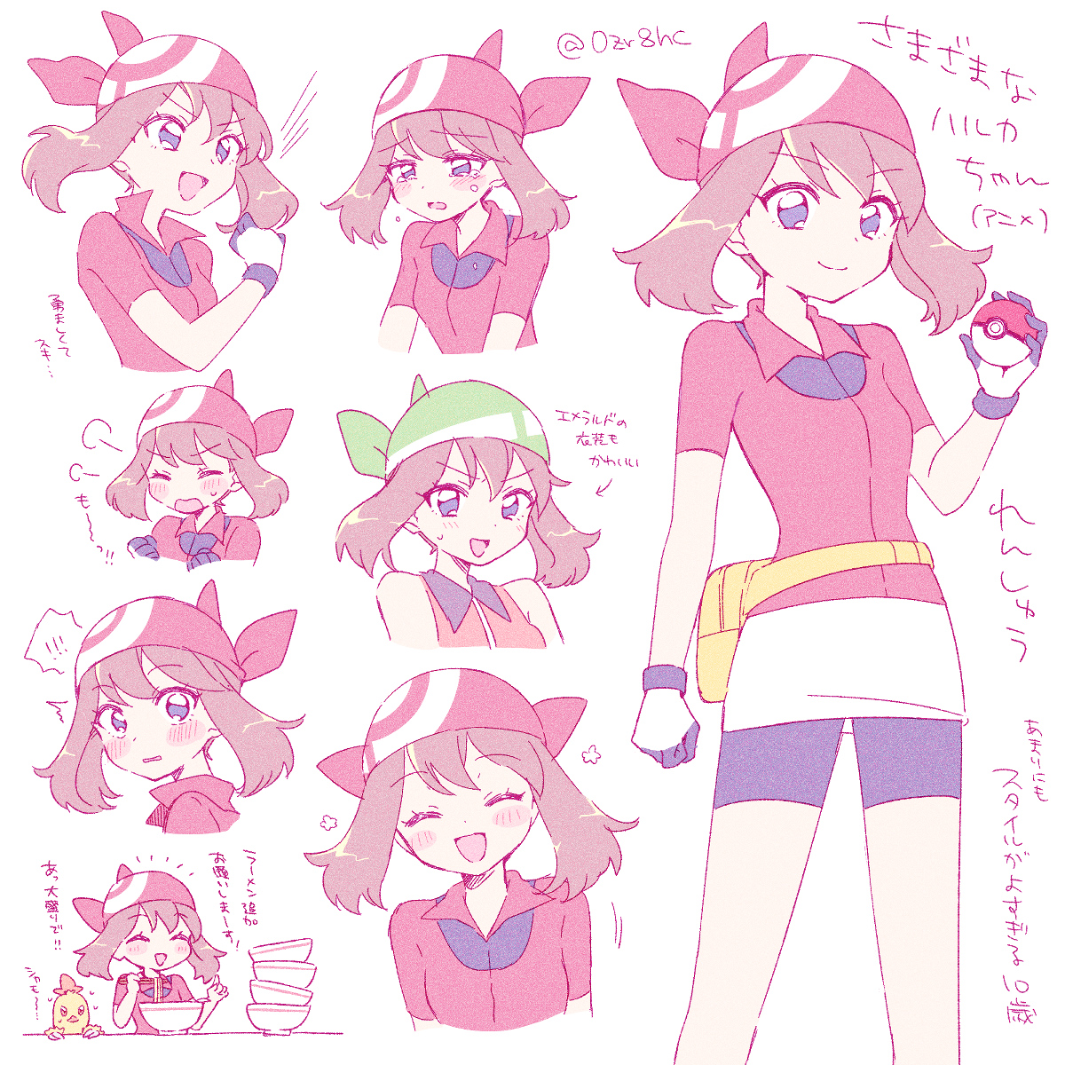 0zr8hc 1girl bandana bike_shorts blue_eyes bowl brown_hair chopsticks clenched_hand closed_mouth collared_shirt combusken commentary_request fanny_pack flower_symbol food gen_3_pokemon gloves highres holding holding_chopsticks holding_poke_ball may_(pokemon) multiple_views nintendo noodles poke_ball poke_ball_(basic) pokemon pokemon_(anime) pokemon_(creature) pokemon_the_series:_diamond_and_pearl pokemon_the_series:_ruby_and_sapphire red_bandana red_shirt shirt short_sleeves skirt smile translation_request twitter_username white_gloves white_skirt yellow_bag