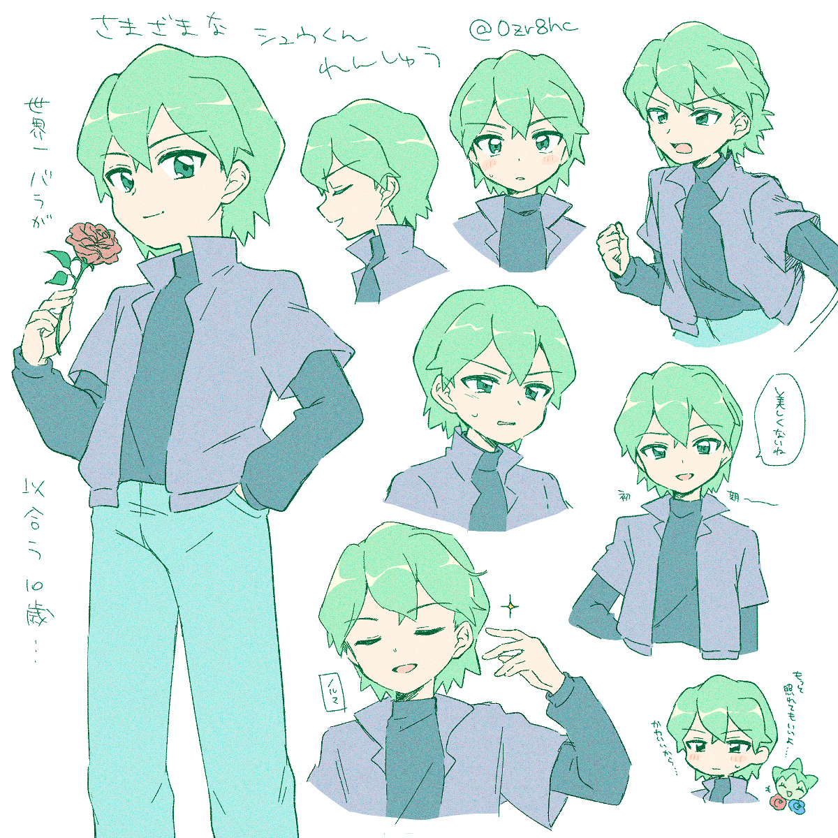 0zr8hc 1boy clenched_hand closed_eyes commentary_request crossed_bangs drew_(pokemon) flower gen_3_pokemon green_hair hand_in_pocket highres holding holding_flower jacket long_sleeves looking_at_viewer male_focus multiple_views nintendo open_clothes open_jacket open_mouth pants pokemon pokemon_(anime) pokemon_(creature) pokemon_the_series:_ruby_and_sapphire purple_jacket rose roselia_(pokemon) shirt short_hair smile sparkle speech_bubble sweatdrop translation_request twitter_username white_background