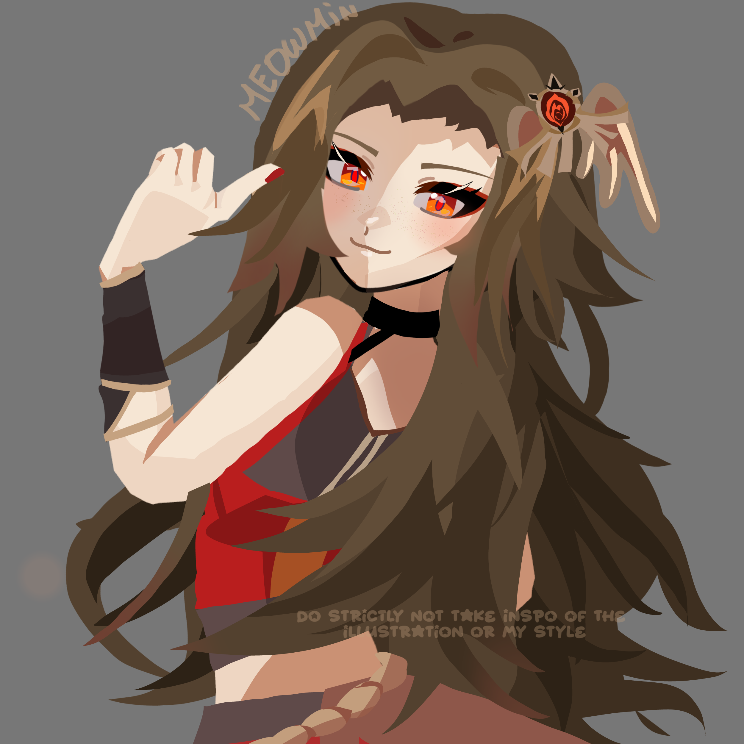 1girl absurdres alice_leah aly_doppelbvnger back brown_hair freckles genshin_impact highres long_hair looking_at_viewer original red_eyes solo