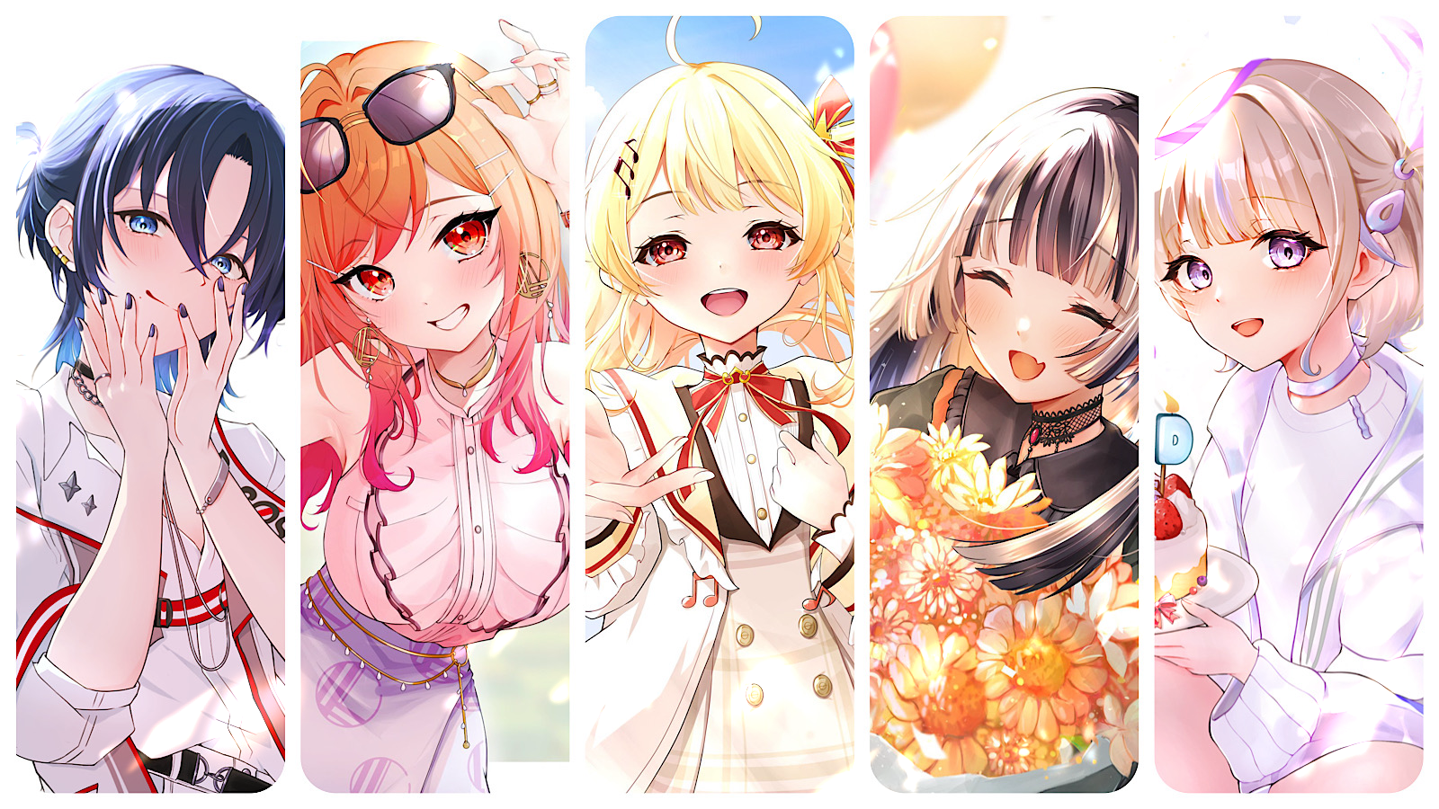 black_hair blonde_hair blue_eyes blue_hair blush collared_shirt eyewear_on_head gothic_lolita grey_hair grey_jacket hair_ornament hairclip hairpin highres hiodoshi_ao hiodoshi_ao_(regloss_uniform) holding hololive hololive_dev_is ichijou_ririka ichijou_ririka_(1st_costume) jacket jewelry juufuutei_raden juufuutei_raden_(1st_costume) kakapo_green lolita_fashion long_hair long_sleeves looking_at_viewer mole mole_under_mouth multicolored_hair multiple_girls necklace open_mouth orange_eyes orange_hair otonose_kanade otonose_kanade_(1st_costume) pink_shirt purple_hair red_eyes regloss_(hololive) shirt short_hair skirt smile streaked_hair sunglasses todoroki_hajime todoroki_hajime_(1st_costume) two-tone_hair virtual_youtuber white_background white_jacket white_shirt