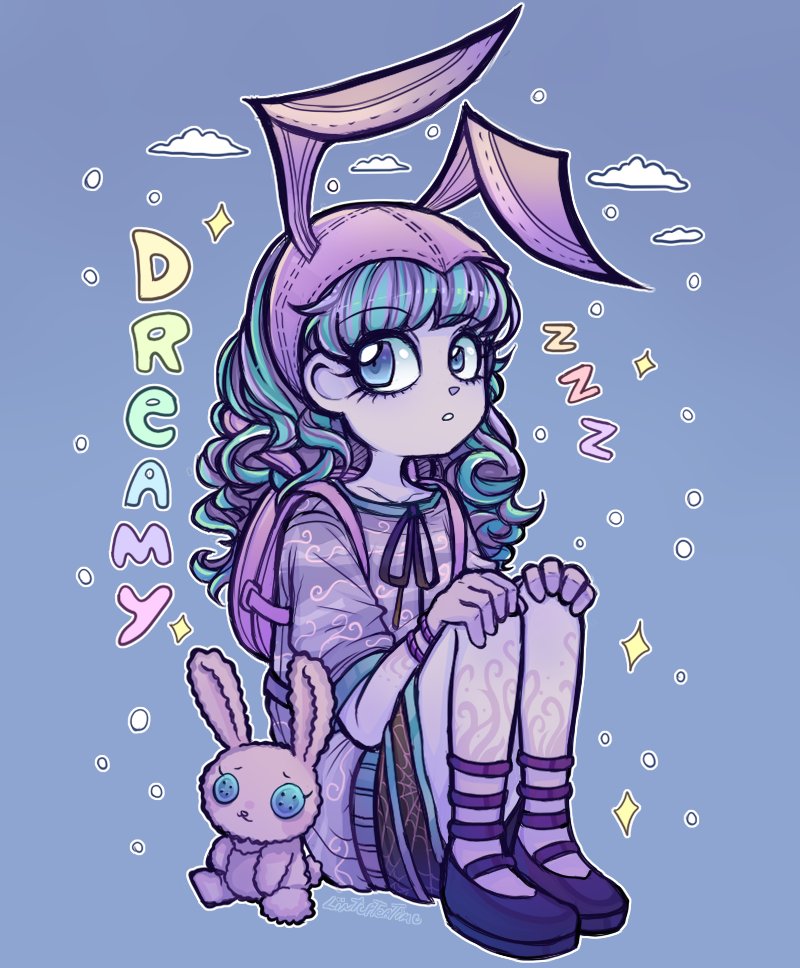 1girl animal_ears blue_eyes colored_skin curly_hair dress dustin_(monster_high) fake_animal_ears linterteatime long_hair monster_high monster_high_(g3) purple_hair purple_shirt purple_skin shirt sitting solo square_eyes stuffed_animal stuffed_rabbit stuffed_toy twyla_boogeyman very_long_hair yume_kawaii