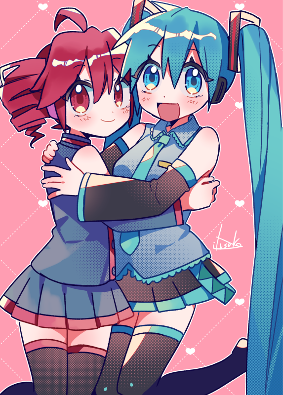 2girls ahoge black_shirt black_skirt black_sleeves black_thighhighs blue_eyes blue_hair blue_necktie blush collared_shirt detached_sleeves double-parted_bangs drill_hair foot_out_of_frame grey_shirt hair_between_eyes hair_ornament hatsune_miku headphones hug kasane_teto kasane_teto_(utau) long_hair long_sleeves looking_at_viewer multiple_girls necktie open_mouth pink_background pleated_skirt red_hair red_trim shirt signature skirt sleeveless sleeveless_shirt standing standing_on_one_leg thighhighs tongue twin_drills twintails utau very_long_hair vocaloid wing_collar yuusuke-kun zettai_ryouiki