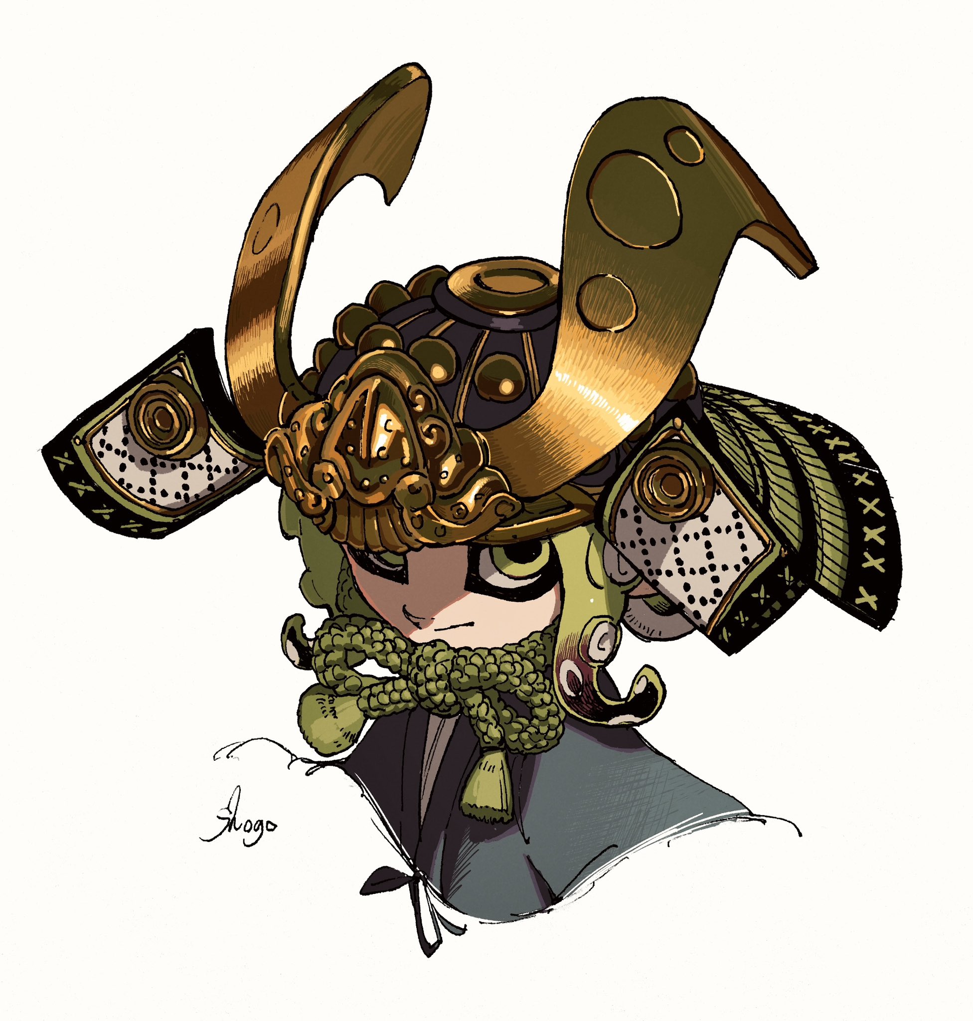 1girl armor artist_name blue_shirt chinstrap closed_mouth commentary_request cropped_shoulders green_eyes green_hair helmet highres japanese_armor kabuto_(helmet) medium_hair multicolored_hair nintendo octoling octoling_girl octoling_player_character red_hair shirt shogo_(shogo70449442) simple_background solo splatoon_(series) suction_cups tentacle_hair two-tone_hair white_background
