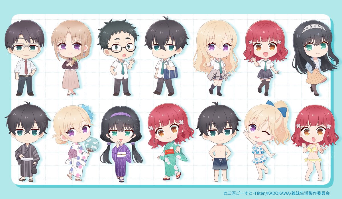 3boys 4girls ;d aqua_border aqua_necktie asamura_yuuta ayase_saki bag bikini bikini_skirt black_hair black_kimono black_pants blonde_hair blue_bikini blue_eyes border chibi chibi_only closed_mouth clothes_around_waist commentary_request copyright_notice floral_print floral_print_bikini flower gimai_seikatsu green_eyes green_kimono hair_between_eyes hair_flower hair_ornament hairband hand_on_own_hip jacket jacket_around_waist japanese_clothes kimono light_brown_hair long_hair looking_at_viewer male_swimwear medium_hair multiple_boys multiple_girls narasaka_maaya necktie nekota_u10 obi one_eye_closed open_mouth orange_skirt pants print_bikini purple_eyes purple_hairband purple_kimono red_eyes red_necktie red_sash sash school_bag school_uniform short_hair skirt smile standing swimsuit topless_male twintails white_background white_hairband white_kimono white_sash yellow_bikini yomiuri_shiori yukata