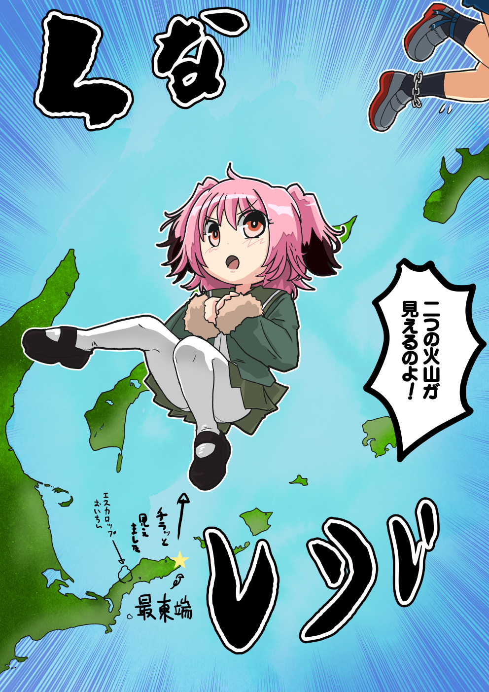 2girls black_hair bow bowtie colored_tips commentary_request etorofu_(kancolle) fur-trimmed_sleeves fur_trim green_jacket green_sailor_collar green_skirt highres island jacket kantai_collection kunashiri_(kancolle) kuril_islands long_sleeves map multicolored_hair multiple_girls name_connection object_namesake orange_eyes pink_hair red_bow red_bowtie sailor_collar school_uniform serafuku short_hair skirt solo_focus translation_request tsun'ichi_(tsun1) two-tone_hair two_side_up