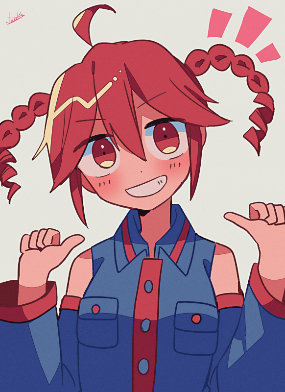 1girl ahoge alternate_hairstyle black_shirt blush buttons collared_shirt detached_sleeves double-parted_bangs grin hair_between_eyes kasane_teto kasane_teto_(utau) long_sleeves pocket pointing pointing_at_self red_eyes red_hair shirt signature sleeveless sleeveless_shirt smile solo twintails upper_body utau white_background wing_collar yuusuke-kun