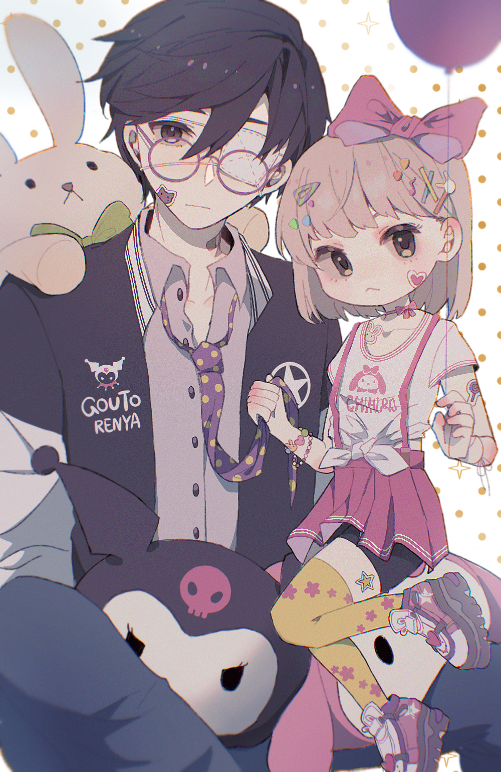 balloon bandaid black_eyes black_hair blonde_hair bow chihiro_(juusan_kihei_bouei_ken) collared_shirt eyepatch glasses gouto_renya hair_bow hair_ornament hairclip highres holding holding_balloon juusan_kihei_bouei_ken looking_at_viewer multicolored_footwear my_melody_(series) necktie onobairan pleated_skirt polka_dot_necktie sanrio shirt shoes skirt sneakers sticker sticker_on_face stuffed_animal stuffed_toy thighhighs too_many_hair_ornaments toy