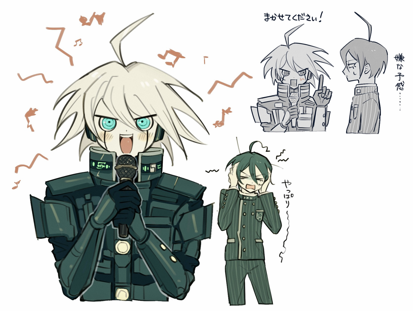 >_< 2boys ahoge android annoyed black_hair black_jacket black_pants blue_eyes buttons closed_mouth collared_jacket commentary covering_own_ears crest cropped_legs cropped_torso danganronpa_(series) danganronpa_v3:_killing_harmony dot_nose double-breasted eyelashes furrowed_brow hair_between_eyes half-closed_eyes happy highres holding holding_microphone jacket k1-b0 layered_sleeves light_blush long_sleeves looking_at_another male_focus microphone morning_(d0nteat) multiple_boys multiple_views music musical_note open_mouth own_hands_together pants partially_colored pinstripe_jacket pinstripe_pants pinstripe_pattern pocket pointing pointing_up saihara_shuichi short_hair shout_lines simple_background singing smile straight-on sweatdrop teeth translation_request undershirt upper_teeth_only wavy_mouth white_background white_hair
