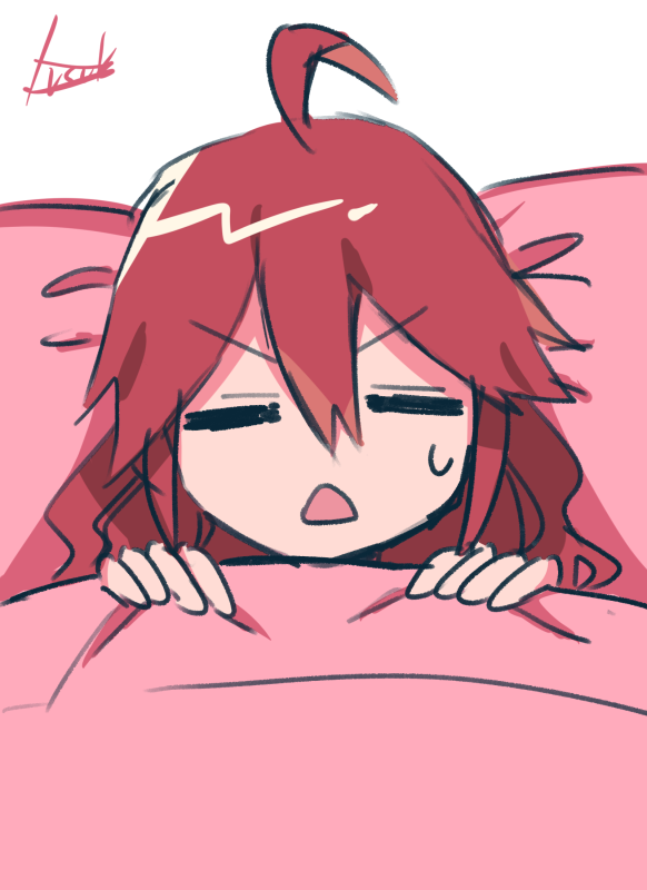 1girl ahoge alternate_hairstyle bed blanket close-up closed_eyes double-parted_bangs hair_between_eyes kasane_teto lying open_mouth pillow red_eyes simple_background sleeping solo sweatdrop triangle_mouth utau white_background yuusuke-kun